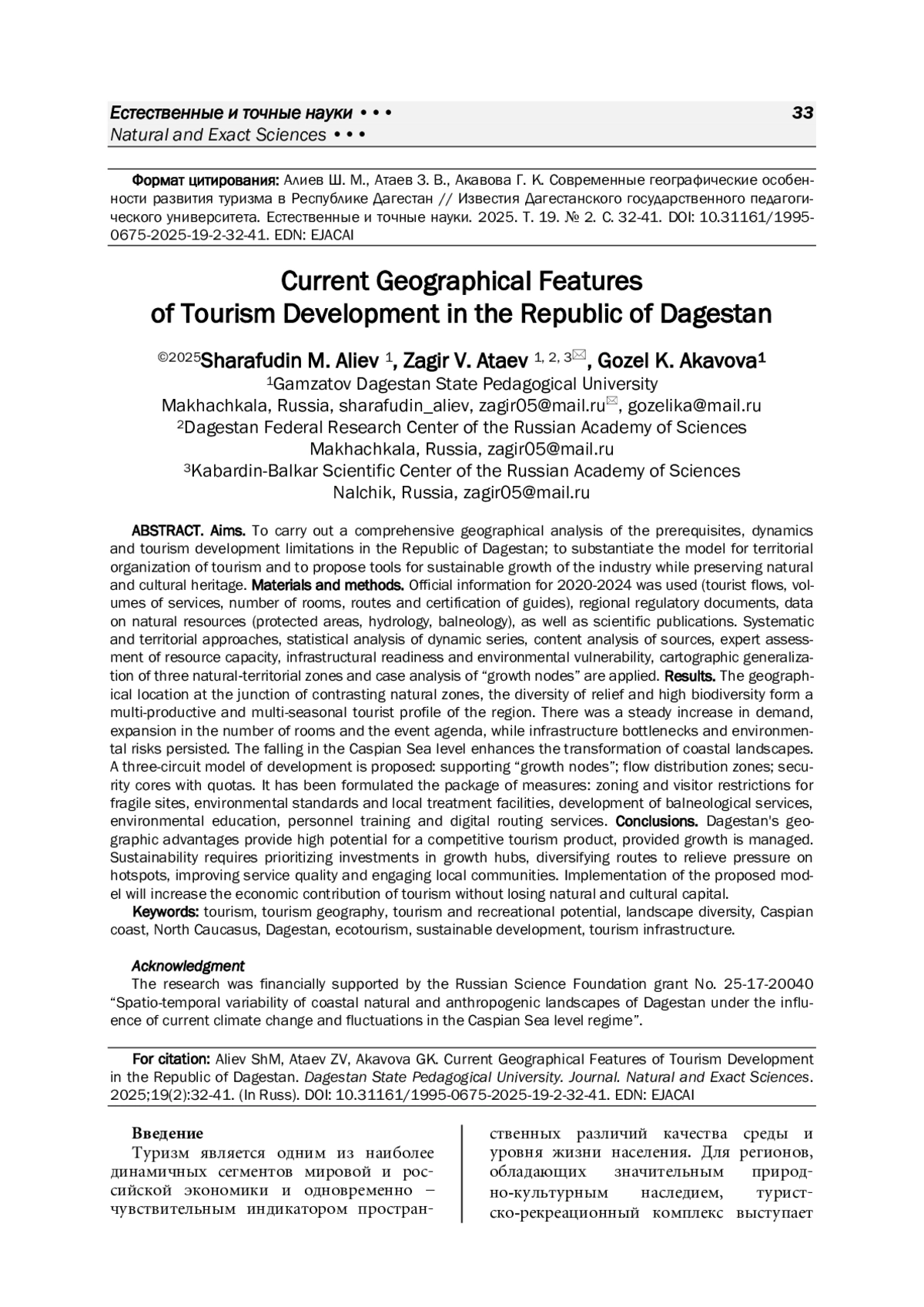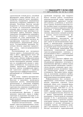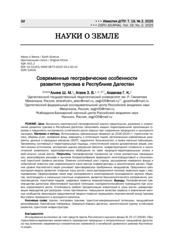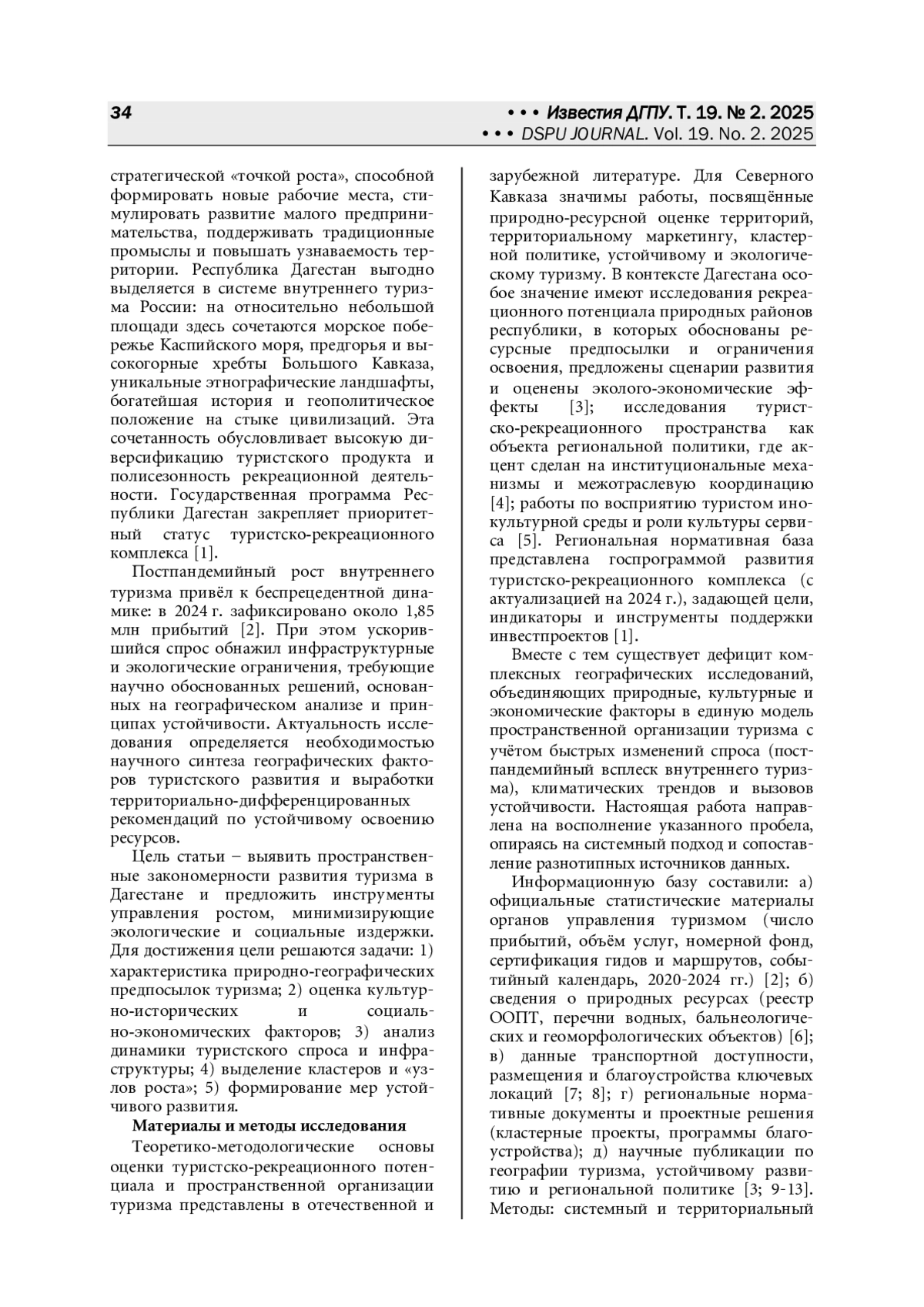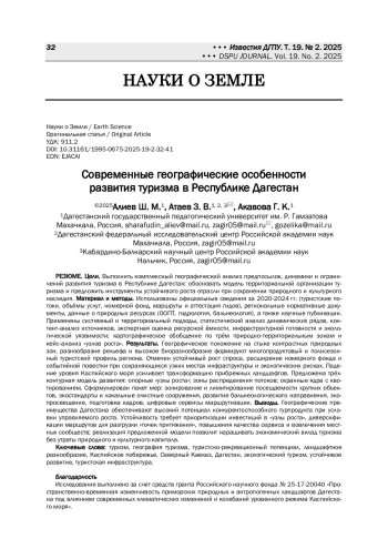Цели. Выполнить комплексный географический анализ предпосылок, динамики и ограничений развития туризма в Республике Дагестан; обосновать модель территориальной организации туризма и предложить инструменты устойчивого роста отрасли при сохранении природного и культурного наследия. Материал и методы. Использованы официальные сведения за 2020-2024 гг. (туристские потоки, объёмы услуг, номерной фонд, маршруты и аттестация гидов), региональные нормативные документы, данные о природных ресурсах (ООПТ, гидрология, бальнеология), а также научные публикации. Применены системный и территориальный подходы, статистический анализ динамических рядов, контент-анализ источников, экспертная оценка ресурсной ёмкости, инфраструктурной готовности и экологической уязвимости; картографическое обобщение по трём природно-территориальным зонам и кейс-анализ «узлов роста». Результаты. Географическое положение на стыке контрастных природных зон, разнообразие рельефа и высокое биоразнообразие формируют многопродуктовый и полисезонный туристский профиль региона. Отмечен устойчивый рост спроса, расширение номерного фонда и событийной повестки при сохраняющихся узких местах инфраструктуры и экологических рисках. Падение уровня Каспийского моря усиливает трансформацию прибрежных ландшафтов. Предложена трёхконтурная модель развития: опорные «узлы роста»; зоны распределения потоков; охранные ядра с квотированием. Сформулирован пакет мер: зонирование и лимитирование посещаемости хрупких объектов, экостандарты и локальные очистные сооружения, развитие бальнеологического направления, экопросвещение, подготовка кадров, цифровые сервисы маршрутизации. Выводы. Географические преимущества Дагестана обеспечивают высокий потенциал конкурентоспособного турпродукта при условии управляемого роста. Устойчивость требует приоритизации инвестиций в «узлы роста», диверсификации маршрутов для разгрузки «точек притяжения», повышения качества сервиса и вовлечения местных сообществ; реализация предложенной модели позволит наращивать экономический вклад туризма без утраты природного и культурного капитала.