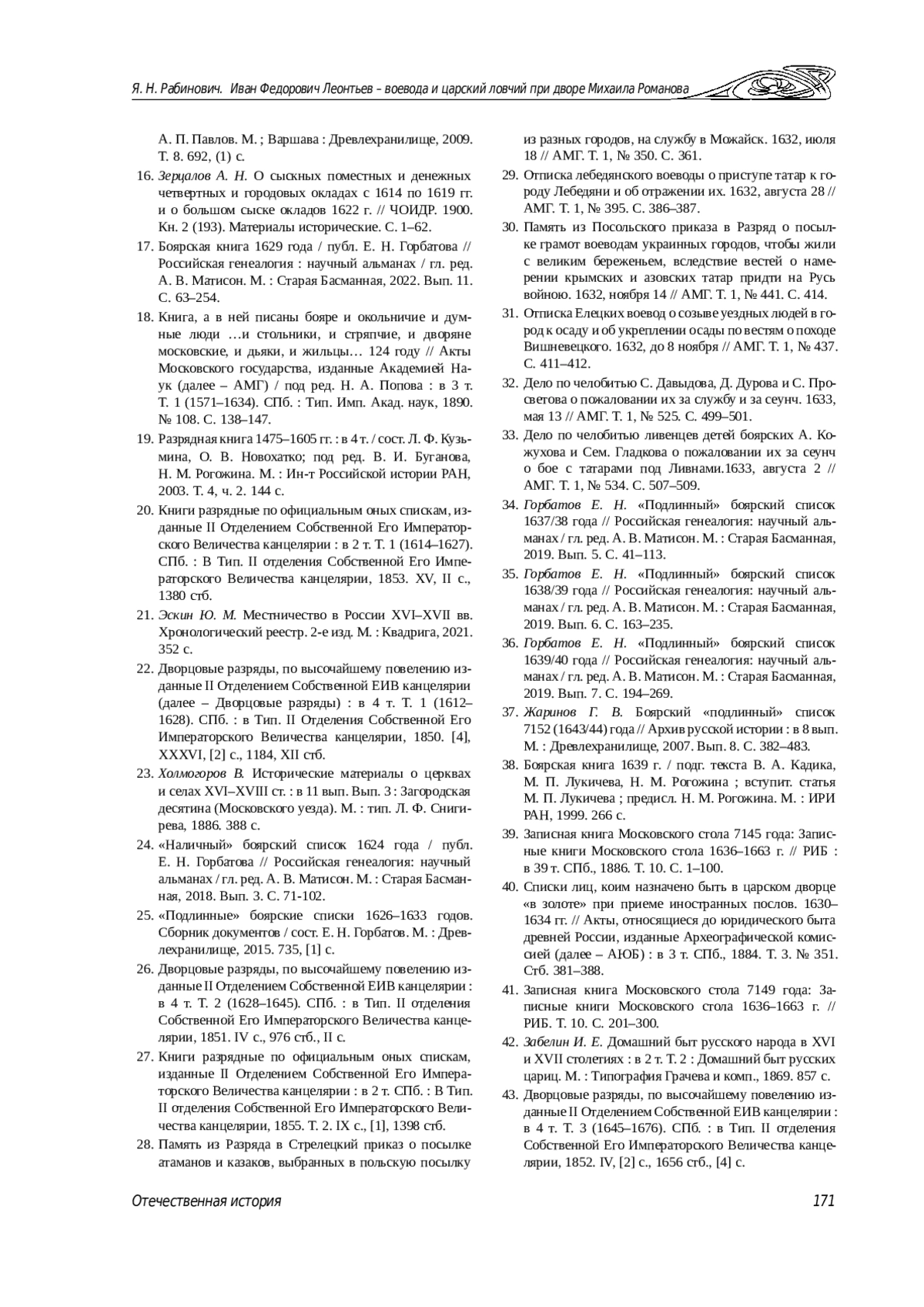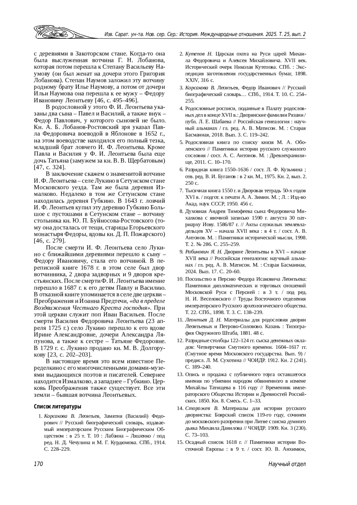 9. Рабинович Я. Н. Дворяне Леонтьевы в XVI - начале XVII века // Российская генеалогия: научный альманах / гл. ред. А. В. Матисон. М.: Старая Басманная, 2024. Вып. 17. С. 20-60.