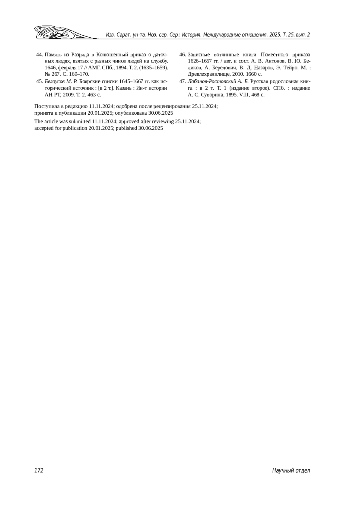 45. Белоусов М. Р. Боярские списки 1645-1667 гг. как исторический источник: [в 2 т.]. Казань: Ин-т истории АН РТ, 2009. Т. 2. 463 с. EDN: QPMUKB
