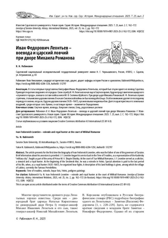 В статье впервые представлена биография Ивана Федоровича Леонтьева, который был отцом одного из воевод Саратова. Приводятся краткие сведения о его предках. Свою службу И. Ф. Леонтьев начал еще в Смутное время, будучи представителем каширского «служилого города», воевал в составе войска князя М. В. Скопина-Шуйского. При дворе царя Михаила Романова И. Ф. Леонтьев служил стряпчим, стольником и царским ловчим. В начале Смоленской войны он был воеводой в Ельце. Особое внимание уделяется последнему периоду его жизни, когда он, будучи царским ловчим(1635–1647), организовывал медвежьи бои. Дается характеристика его земельных владений, среди которых село Лукино, в настоящее время – знаменитое Переделкино.