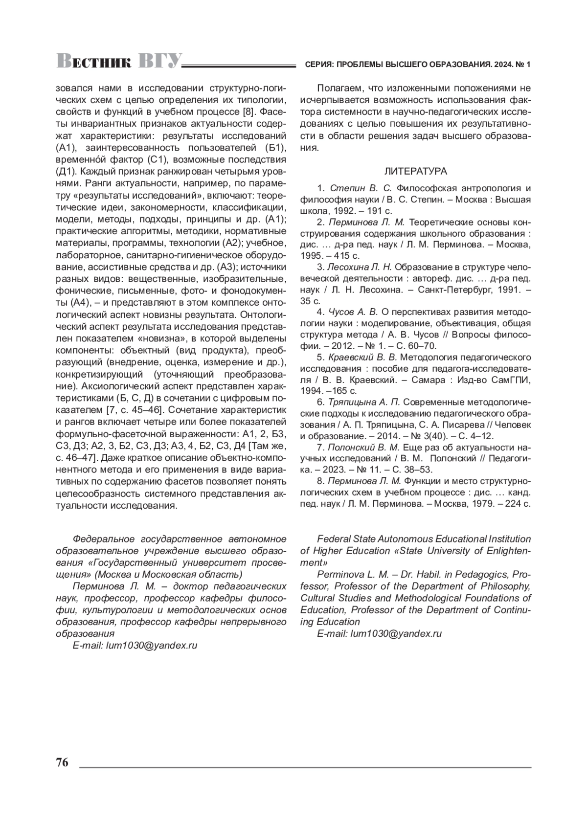 1. Степин В. С. Философская антропология и философия науки / В. С. Степин. - Москва: Высшая школа, 1992. - 191 с. EDN: RLDLYV 2. Перминова Л. М. Теоретические основы конструирования содержания школьного образования: дис. д-ра пед. наук / Л. М. Перминова. - Москва, 1995. - 415 с. 3. Лесохина Л. Н. Образование в структуре человеческой деятельности: автореф. дис. д-ра пед. наук / Л. Н. Лесохина. - Санкт-Петербург, 1991. -35 с. 4. Чусов А. В. О перспективах развития методологии науки: моделирование, объективация, общая структура метода / А. В. Чусов // Вопросы философии. - 2012. - № 1. - С. 60-70. EDN: OPVLDP 5. Краевский В. В. Методология педагогического исследования: пособие для педагога-исследователя / В. В. Краевский. - Самара: Изд-во СамГПИ, 1994. -165 с. 6. Тряпицына А. П. Современные методологические подходы к исследованию педагогического образования / А. П. Тряпицына, С. А. Писарева // Человек и образование. - 2014. - № 3(40). - С. 4-12. EDN: SZULGT 7. Полонский В. М. Еще раз об актуальности научных исследований / В. М. Полонский // Педагогика. - 2023. - № 11. - С. 38-53. EDN: UMRZDZ 8. Перминова Л. М. Функции и место структурнологических схем в учебном процессе: дис. канд. пед. наук / Л. М. Перминова. - Москва, 1979. - 224 с.
