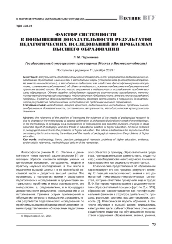 Актуальность проблемы повышения доказательности результатов педагогических исследований обусловлена изменениями в методологии науки (утверждением философского плюрализма вместо моноидеологии), в методологии педагогики как следствие философско-научного плюрализма, изменением представлений об объекте педагогики, новыми тенденциями в образовательной практике высшей школы. Все это нашло отражение в педагогических исследованиях проблем высшего образования. Однако нередко наблюдается нарушение системности исследования, неполнота его методологической структуры, недостаточная убедительность актуальности исследуемой проблемы. В статье обосновывается значимость фактора системности в повышении доказательности результатов педагогических исследований по проблемам высшего образования.