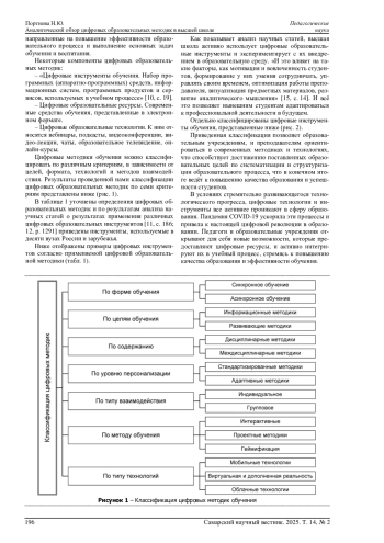 Статья посвящена обзору цифровых образовательных методик, применяемых в высшей школе, с акцентом на их влияние на образовательный процесс. В условиях стремительного развития технологий и цифровой трансформации общества, образование сталкивается с необходимостью адаптации к новым реалиям. Рассматриваются ключевые аспекты внедрения цифровых технологий в образовательную среду, включая использование онлайн-платформ, вебинаров, видеоконференций и других инструментов. Особое внимание уделено анализу когнитивных и аффективных эффектов цифрового обучения, влиянию на мотивацию студентов, формирование навыков управления временем и аналитического мышления. Автор подчеркивает важность систематизации цифровых методик и разработки комплексных решений для интеграции технологий в образовательный процесс. Рассматриваются примеры успешного применения цифровых инструментов в российских и зарубежных вузах. Делается вывод о необходимости дальнейшего изучения влияния цифровизации на образование, а также прогноза ее развития в контексте государственной политики и требований цифровой экономики. Статья актуализирует проблему формирования теоретических основ для использования цифровых методик, что способствует повышению качества образования и профессиональной подготовки студентов.