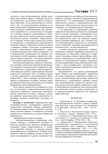 Экспериментально установлено, что слабо организованные студенческие команды в напряженных условиях совместной спортивной деятельности характеризуются низкой надежностью по сравнению со стандартными условиями. Такая отличительная особенность этих команд не позволяет с уверенностью прогнозировать их успешность в соревнованиях. При этом в любых условиях деятельности у команд на первый план выходит не предварительная ориентировка в условиях и планирование деятельности, а ее исполнительская часть, которая в отсутствие плана или при наличии низкокачественного плана приобретает характер стихийности, неуправляемости.