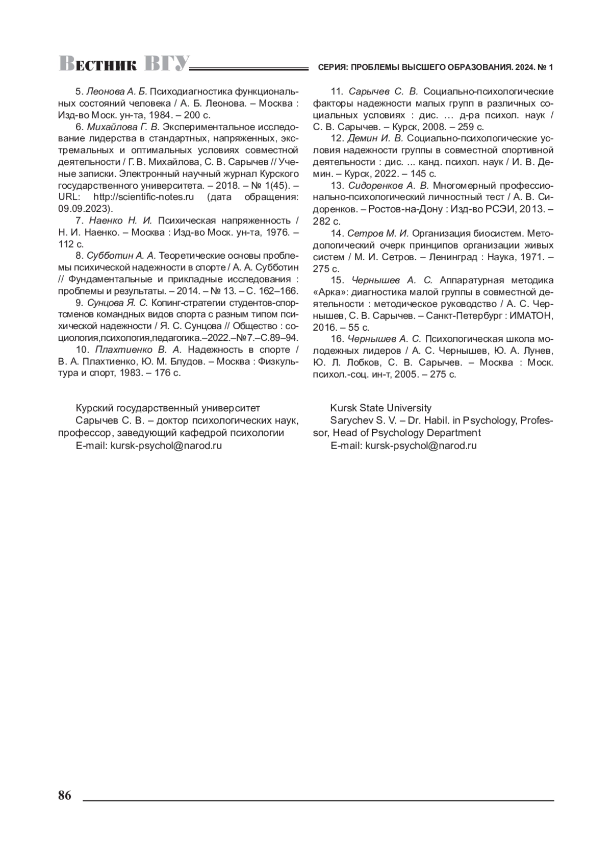 11. 	Сарычев С. В. Социально-психологические факторы надежности малых групп в различных социальных условиях: дис.. д-ра психол. наук / С. В. Сарычев. - Курск, 2008. - 259 с. EDN: NKQOHJ