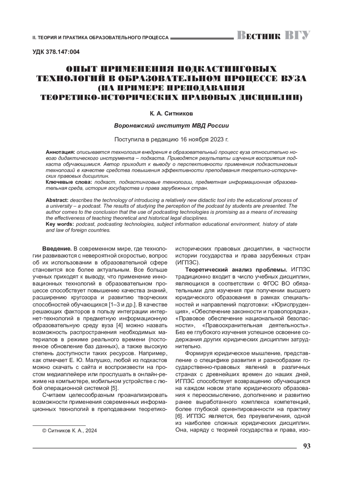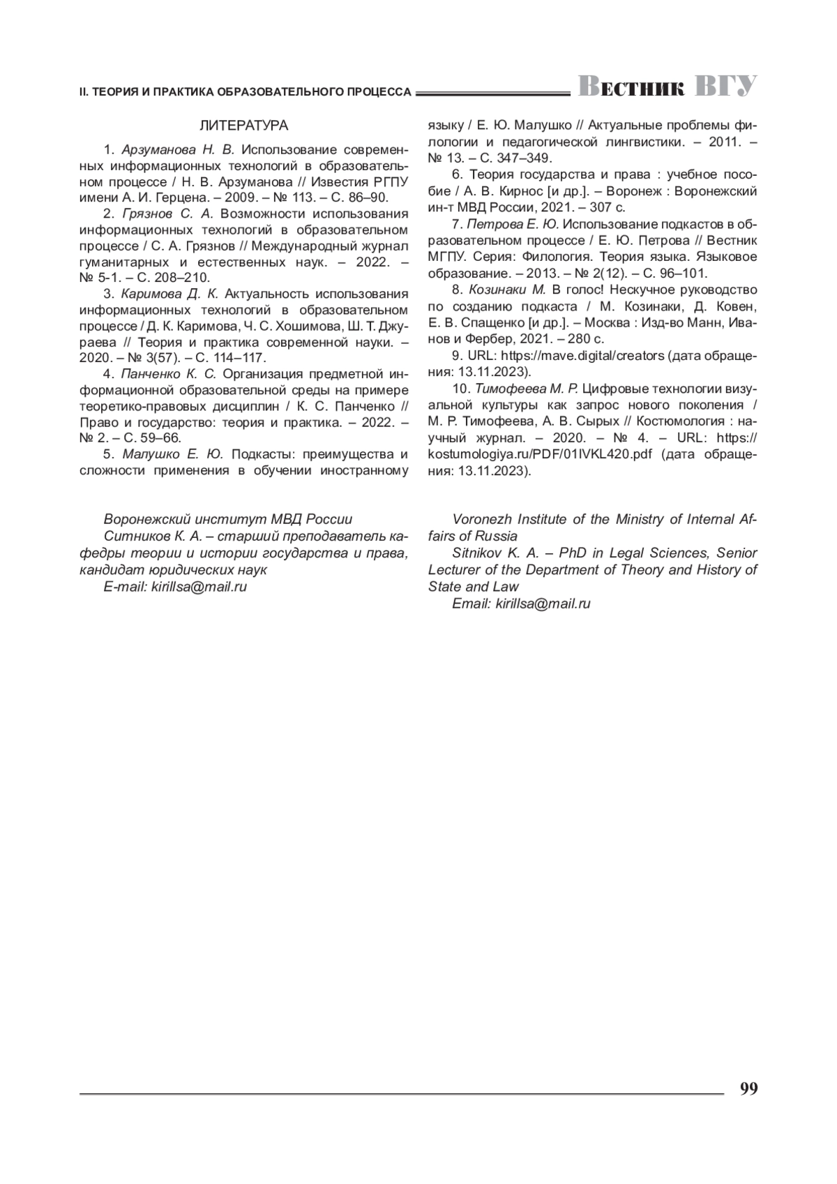 4. 	Панченко К. С. Организация предметной информационной образовательной среды на примере теоретико-правовых дисциплин / К. С. Панченко // Право и государство: теория и практика. - 2022. -№ 2. - С. 59-66. EDN: NQAAYW