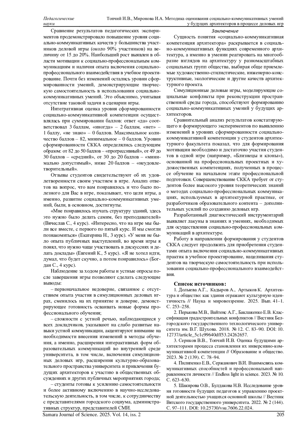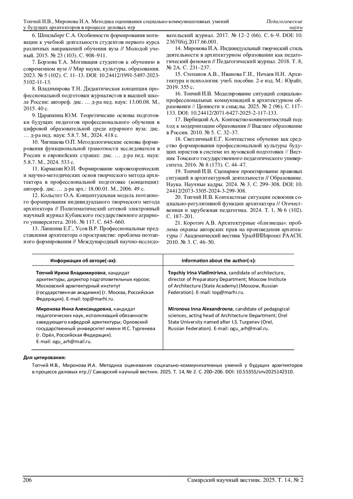 16. 	Топчий И.В. Моделирование ситуаций социально-профессиональных коммуникаций в архитектурном образовании // Ценности и смыслы. 2025. № 2 (96). С. 117-133. DOI: 10.24412/2071-6427-2025-2-117-133 EDN: OLUDJL