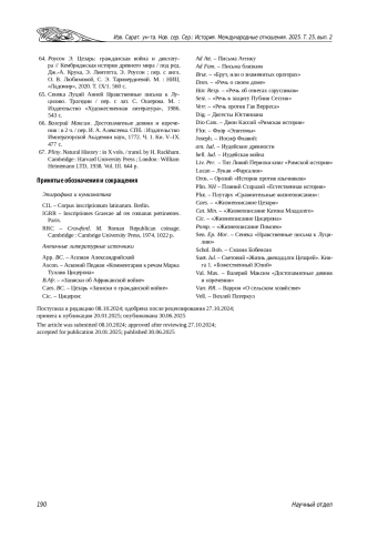 64. Роусон Э. Цезарь: гражданская войне и диктатура // Кембриджская история древнего мира / под ред. Дж.-А. Крука, Э. Линтотта, Э. Роусон; пер. с англ. О. В. Любимовой, С. Э. Таривердиевой. М.: НИЦ “Ладомир”, 2020. Т. IX/1. 560 с.
