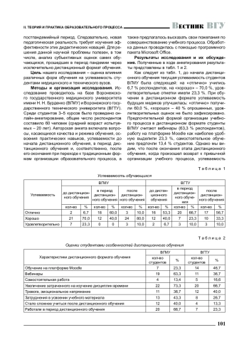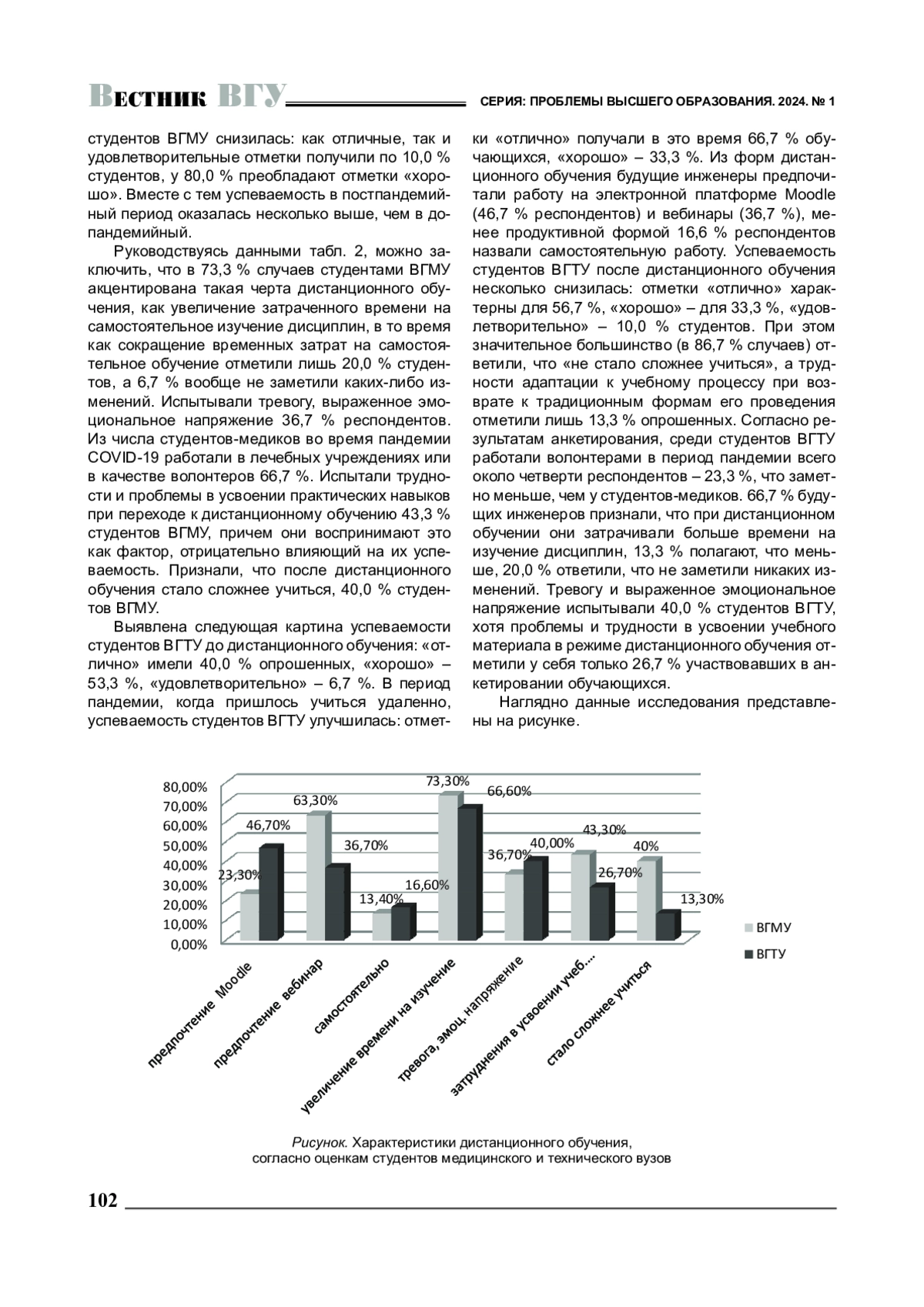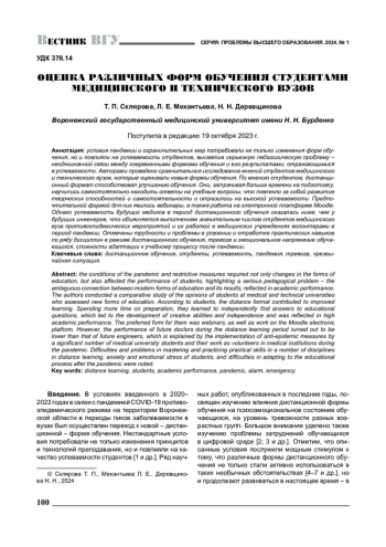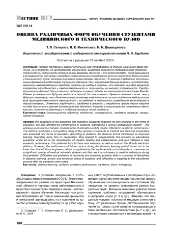 Условия пандемии и ограничительных мер потребовали не только изменения форм обучения, но и повлияли на успеваемость студентов, высветив серьезную педагогическую проблему -неоднозначной связи между современными формами обучения и его результатами, отражающимися в успеваемости. Авторами проведено сравнительное исследование мнений студентов медицинского и технического вузов, которые оценивали новые формы обучения. По мнению студентов, дистанционный формат способствовал улучшению обучения. Они, затрачивая больше времени на подготовку, научились самостоятельно находить ответы на учебные вопросы, что повлекло за собой развитие творческих способностей и самостоятельности и отразилось на высокой успеваемости. Предпочтительной формой для них явились вебинары, а также работа на электронной платформе Moodle. Однако успеваемость будущих медиков в период дистанционного обучения оказалась ниже, чем у будущих инженеров, что объясняется выполнением значительным числом студентов медицинского вуза противоэпидемических мероприятий и их работой в медицинских учреждениях волонтерами в период пандемии. Отмечены трудности и проблемы в усвоении и отработке практических навыков по ряду дисциплин в режиме дистанционного обучения, тревога и эмоциональное напряжение обучающихся, сложности адаптации к учебному процессу после пандемии.