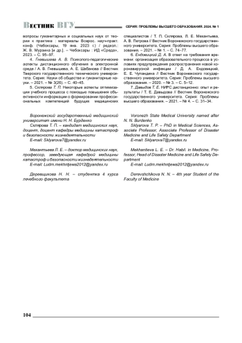 7. 	Давыдов Т. Е. НИРС дистанционно: опыт и результаты / Т. Е. Давыдова // Вестник Воронежского государственного университета. Серия: Проблемы высшего образования. - 2021. - № 4. - С. 31-34. EDN: UZSHWI