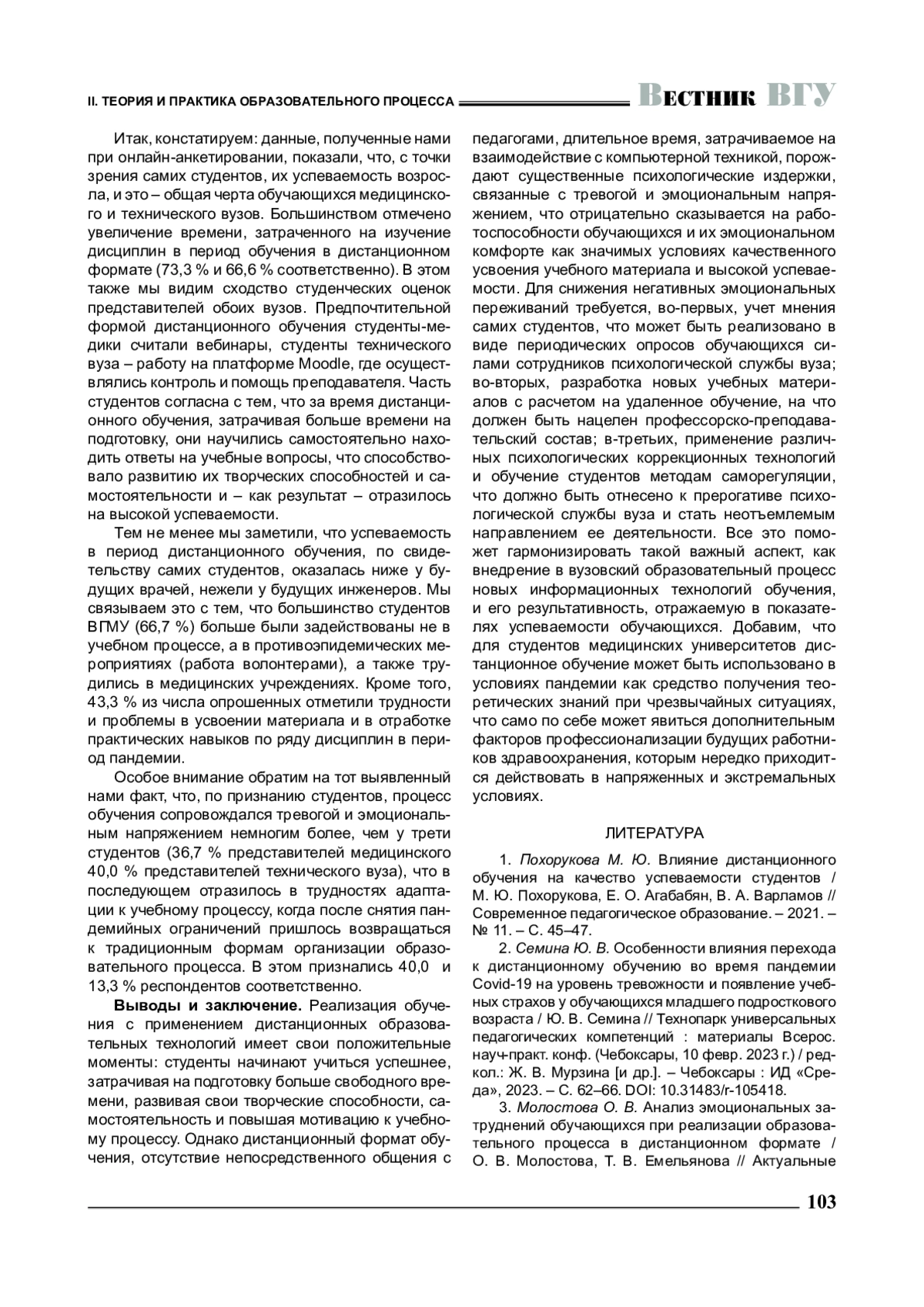 3. 	Молостова О. В. Анализ эмоциональных затруднений обучающихся при реализации образовательного процесса в дистанционном формате / О. В. Молостова, Т. В. Емельянова // Актуальные вопросы гуманитарных и социальных наук от теории к практике: материалы Всерос. науч-практ. конф. (Чебоксары, 19 янв. 2023 г.) / редкол.: Ж. В. Мурзина [и др.]. - Чебоксары: ИД “Среда”, 2023. - С. 95-97. EDN: KTUSSY