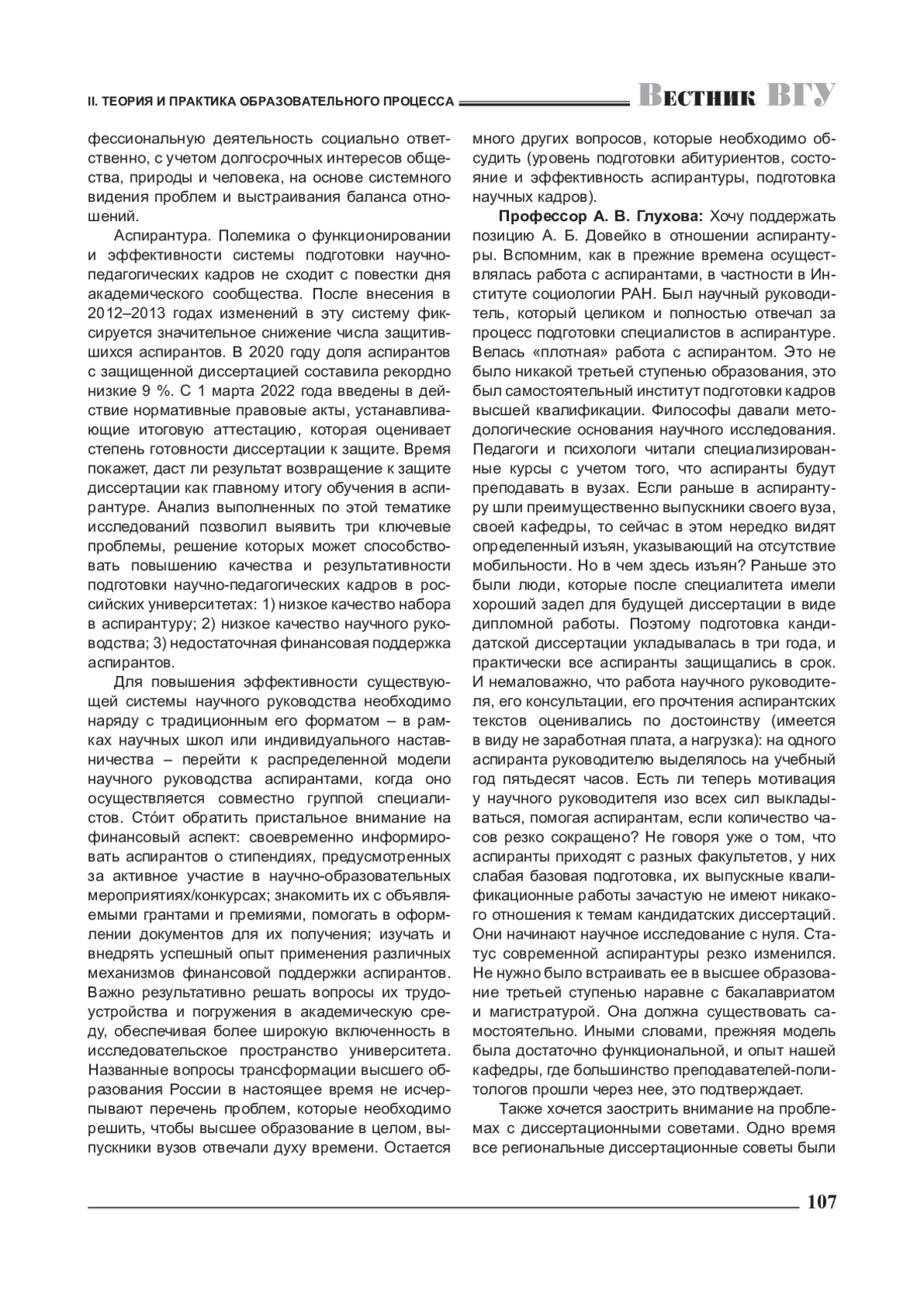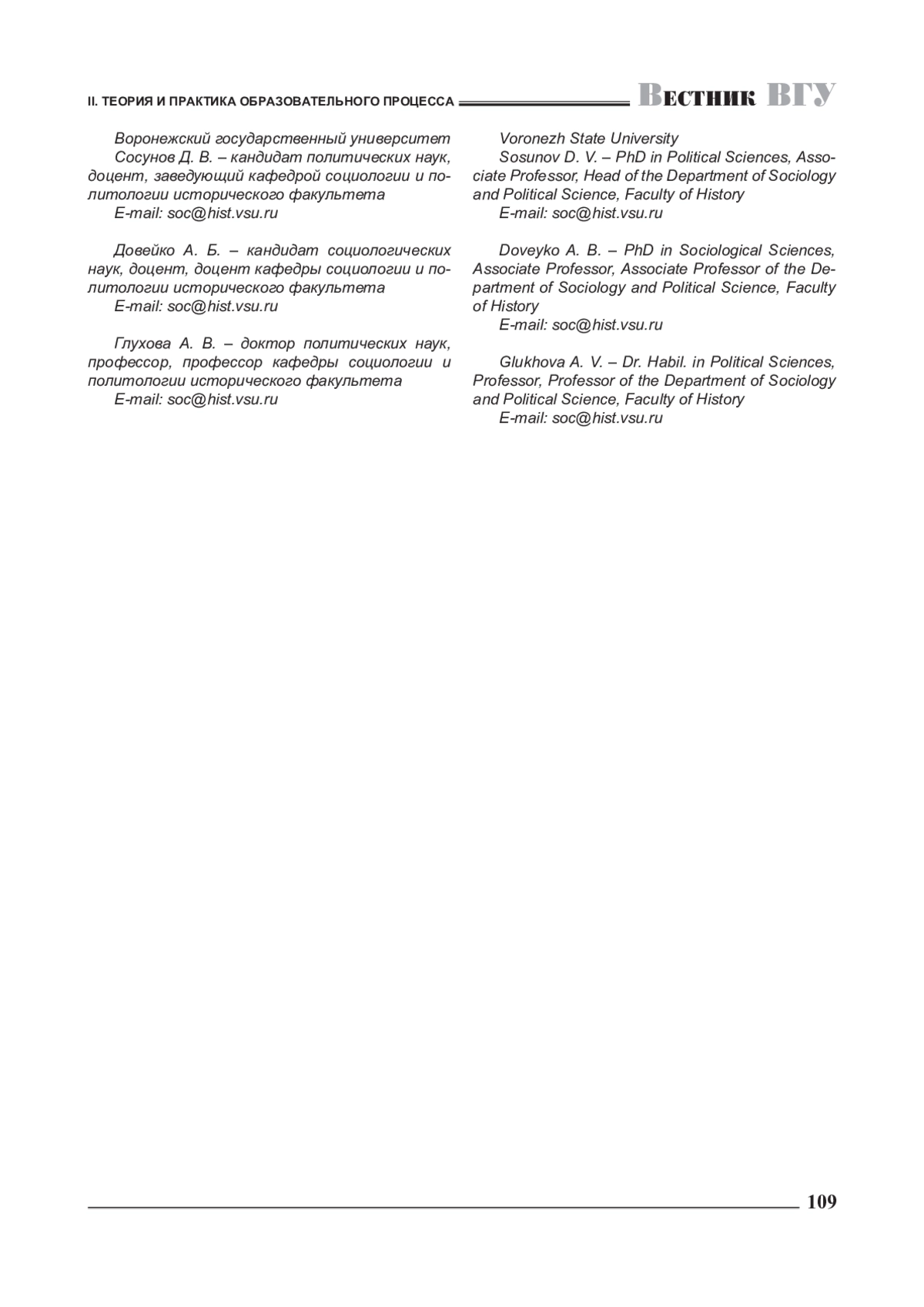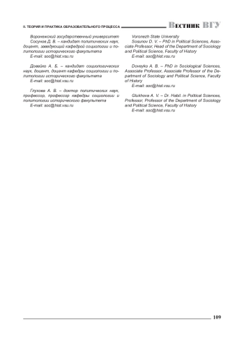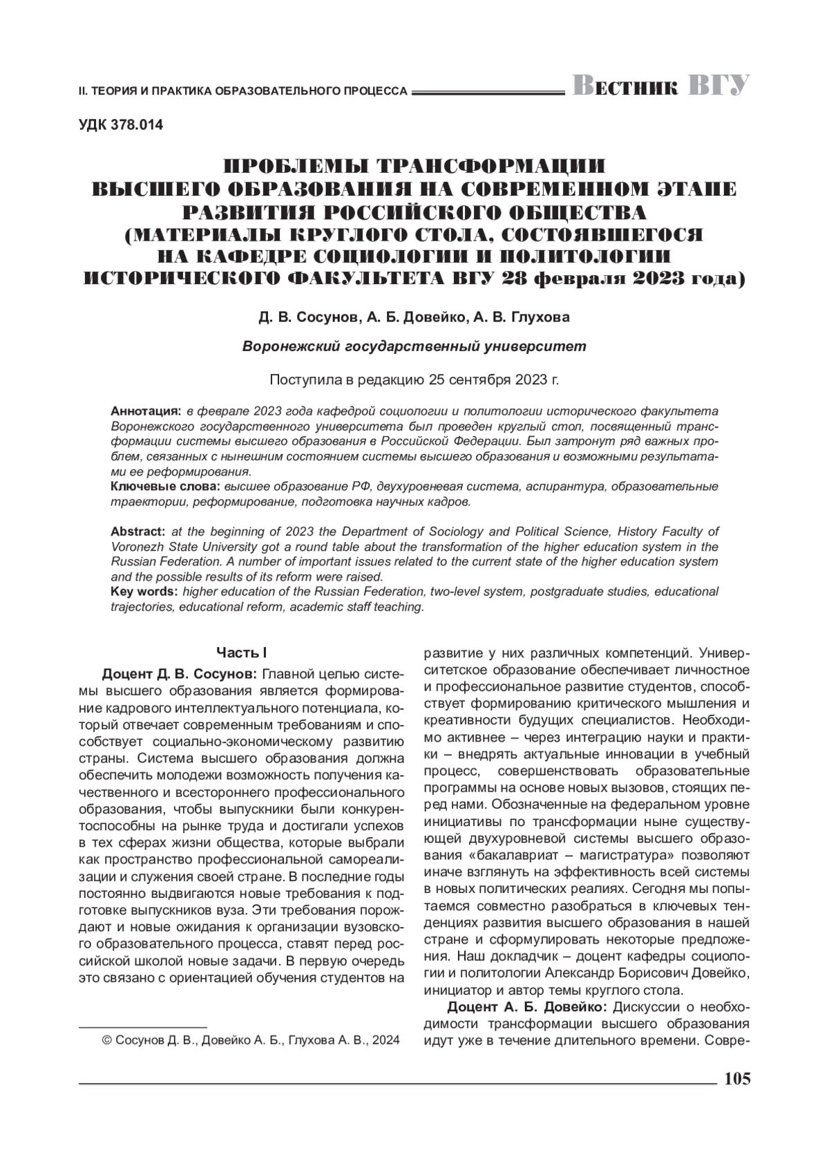 В феврале 2023 года кафедрой социологии и политологии исторического факультета Воронежского государственного университета был проведен круглый стол, посвященный трансформации системы высшего образования в Российской Федерации. Был затронут ряд важных проблем, связанных с нынешним состоянием системы высшего образования и возможными результатами ее реформирования.