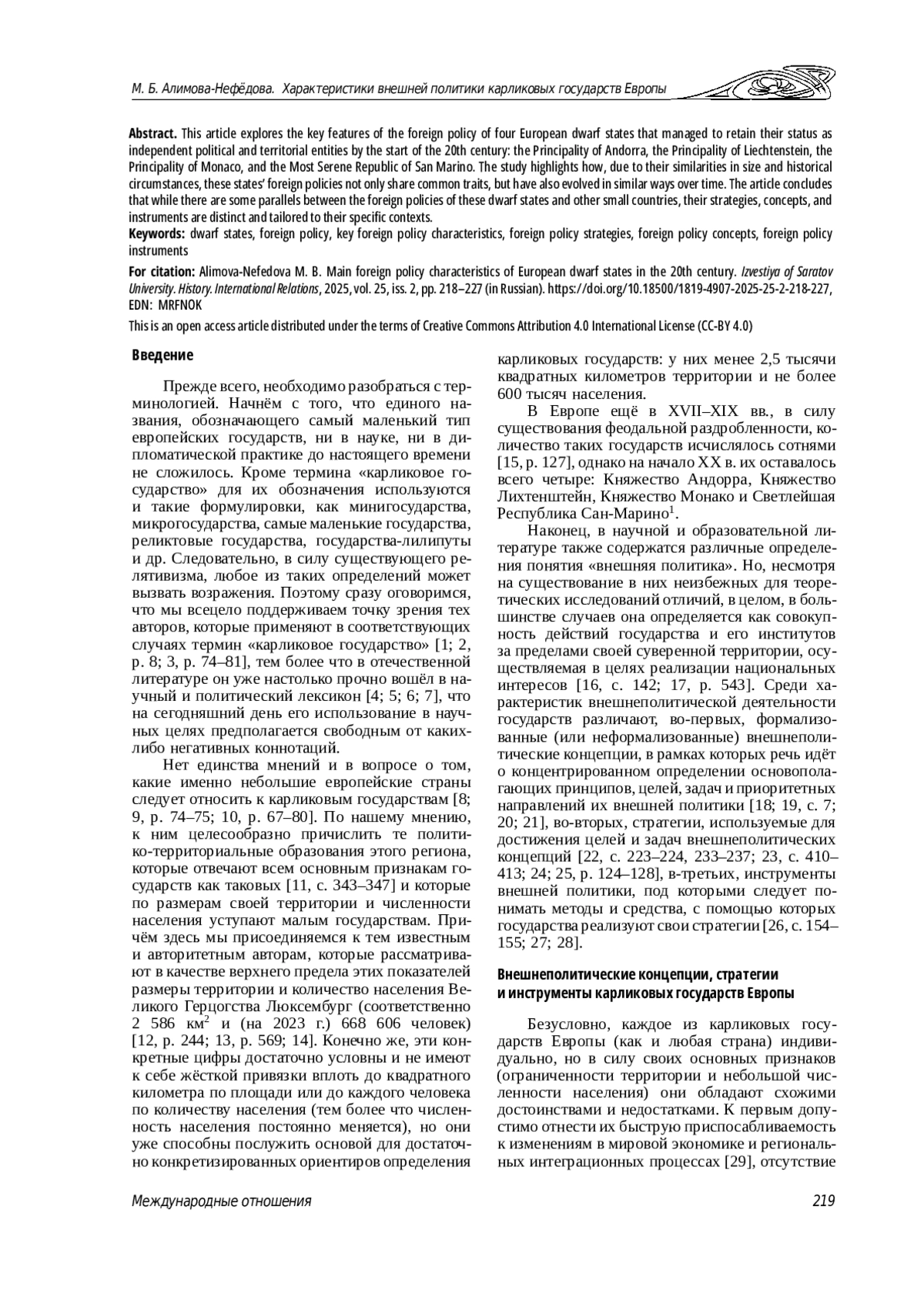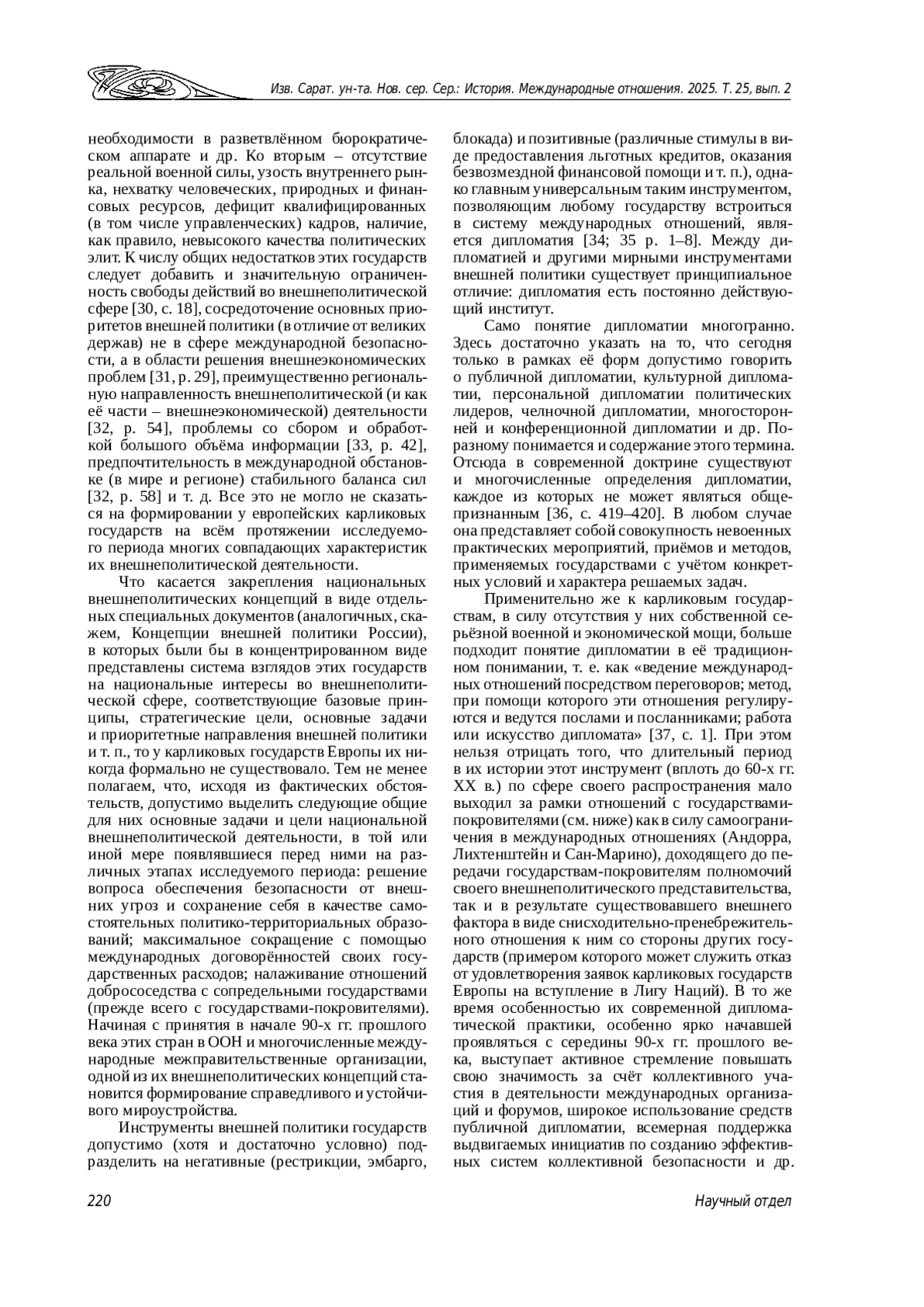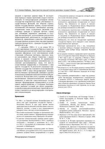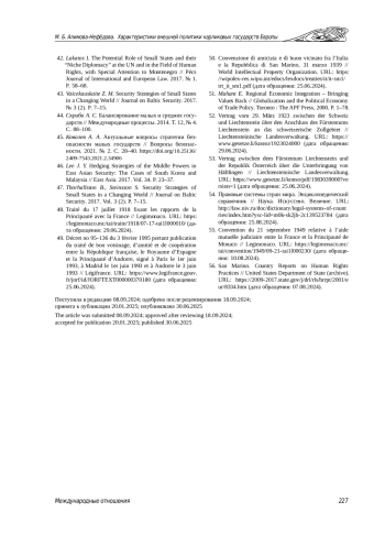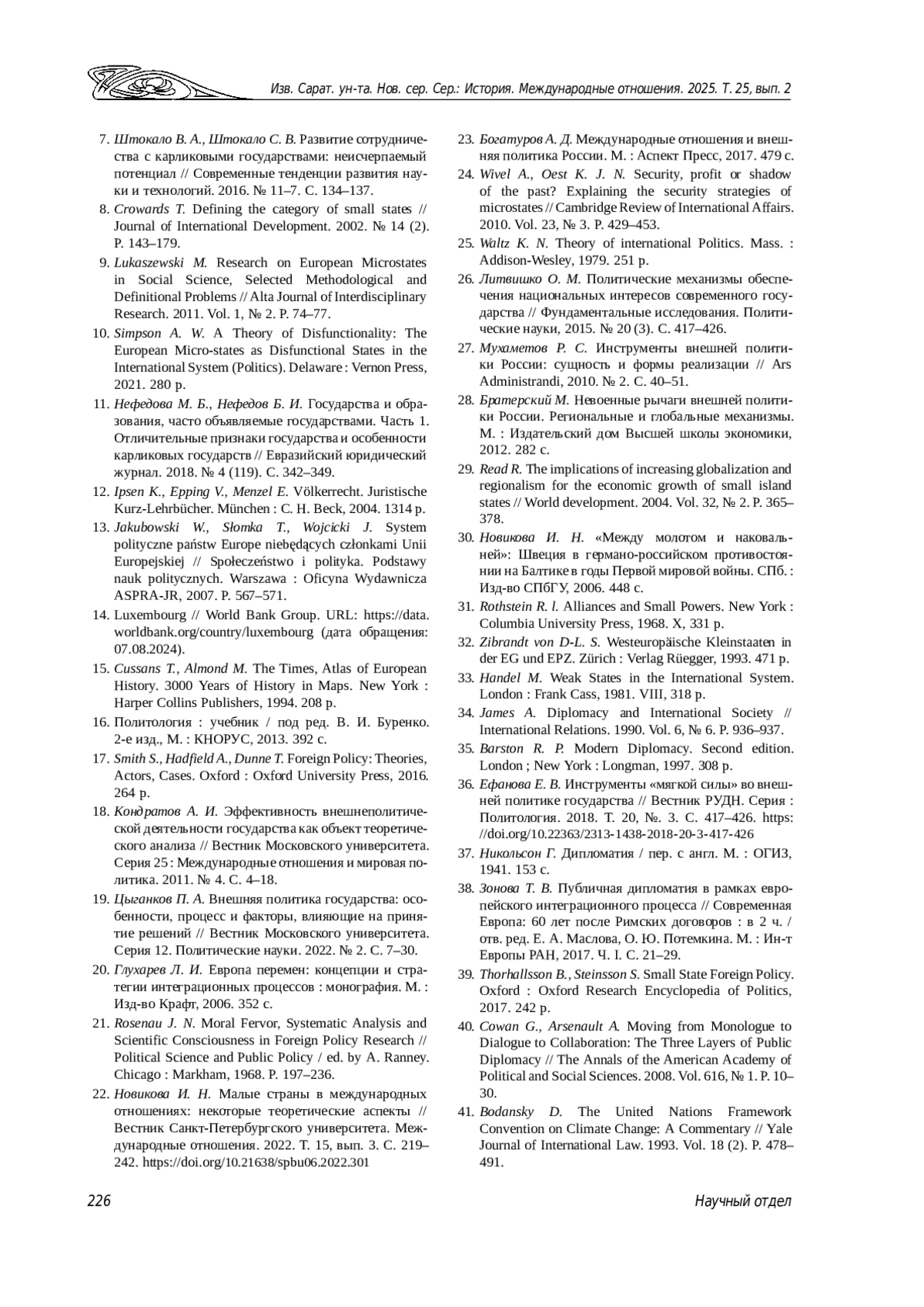 22. 	Новикова И. Н. Малые страны в международных отношениях: некоторые теоретические аспекты // Вестник Санкт-Петербургского университета. Международные отношения. 2022. Т. 15, вып. 3. С. 219-242. DOI: 10.21638/spbu06.2022.301 EDN: EHMKUH