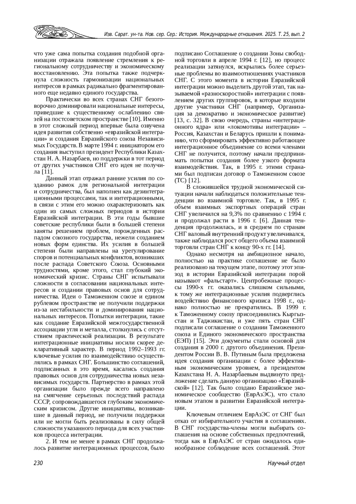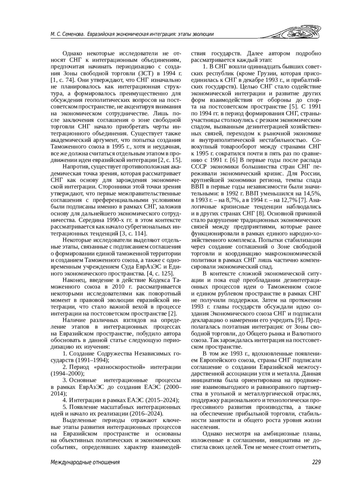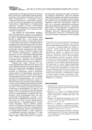 1. Андронова И. В. Эволюция интеграционных процессов на постсоветском пространстве // Вестник РУДН. 2012. № 55. С. 72-81.