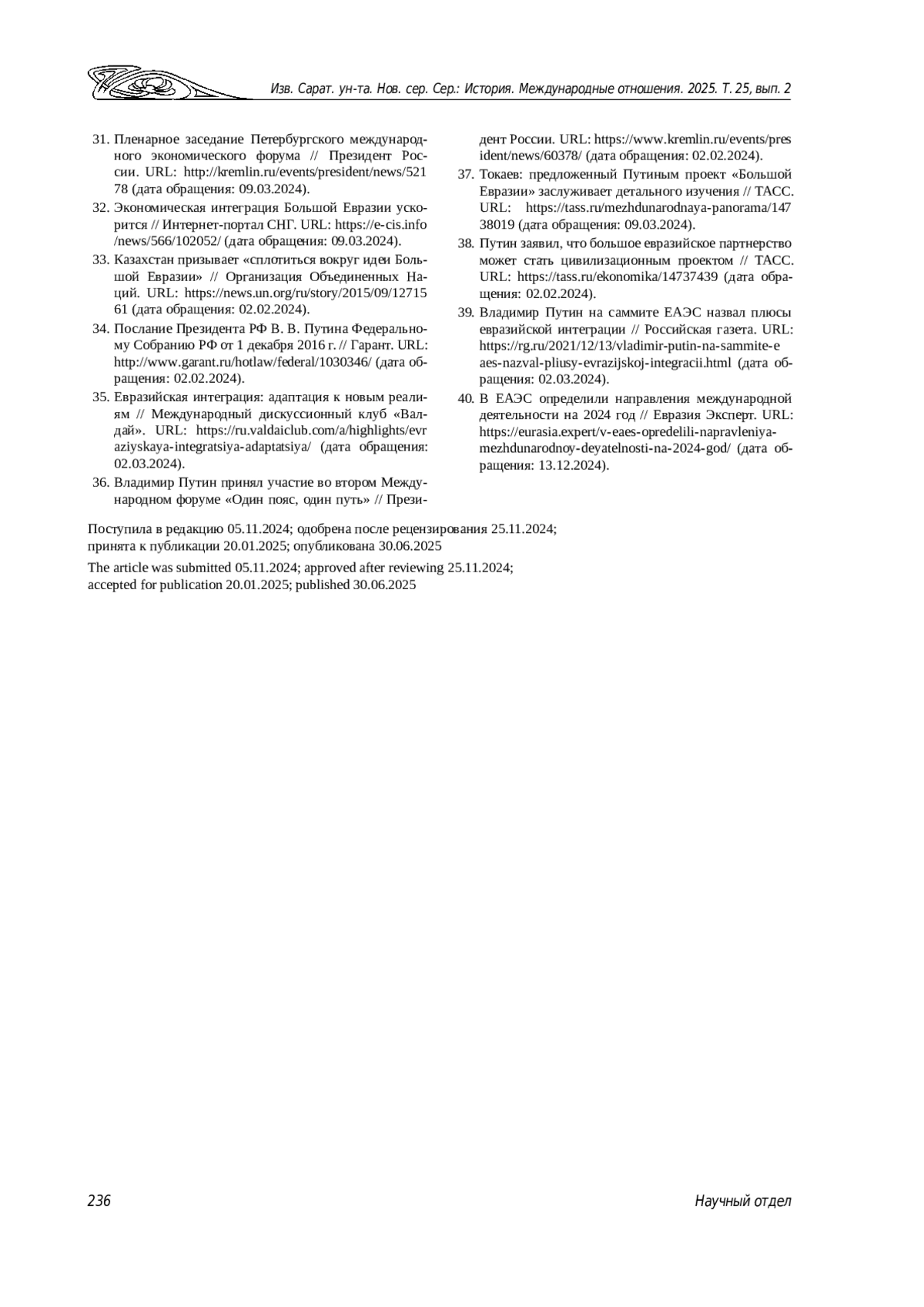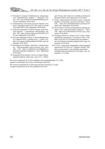39. Владимир Путин на саммите ЕАЭС назвал плюсы евразийской интеграции // Российская газета. URL: https://rg.ru/2021/12/13/vladimir-putin-na-sammite-eaes-nazval-pliusy-evrazijskoj-integracii.html (дата обращения: 02.03.2024).