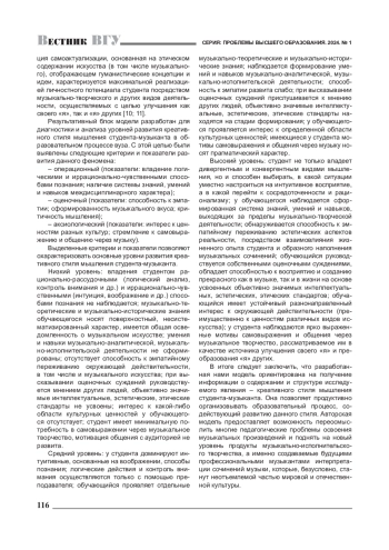 Высокий уровень: студент не только владеет дивергентным и конвергентным видами мышления, но и способен выбирать, в какой ситуации уместно настроиться на интуитивное восприятие, а в какой перейти к сосредоточенности и рационализму; у обучающегося наблюдается сформированная система знаний, умений и навыков, выходящих за пределы музыкально-творческой деятельности; обнаруживается способность к эмпатийному переживанию эстетических аспектов реальности, посредством взаимовлияния жизненного опыта студента и образного наполнения музыкальных сочинений; обучающийся руководствуется собственными оценочными суждениями, обладает способностью к восприятию и созданию прекрасного как в музыке, так и в жизни на основе усвоенных объективно значимых интеллектуальных, эстетических, этических стандартов; обучающийся имеет устойчивый разнонаправленный интерес к окружающей действительности (преимущественно к ценностям различных видов искусства); у студента наблюдаются ярко выраженные мотивы самовыражения и общения через музыкальное творчество, рассматриваемое им в качестве источника улучшения своего «я» и преобразования «я» других.