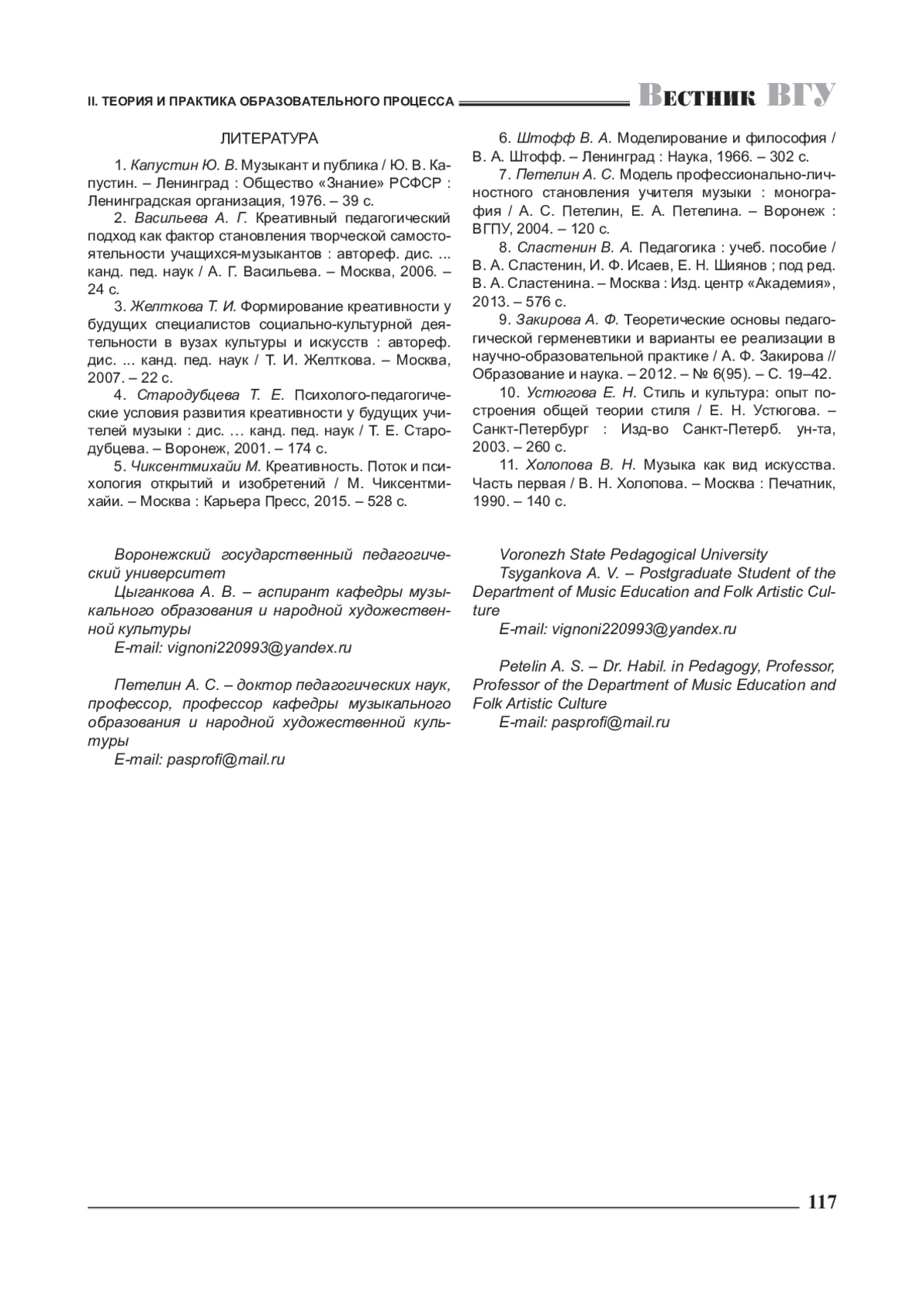 2. 	Васильева А. Г. Креативный педагогический подход как фактор становления творческой самостоятельности учащихся-музыкантов: автореф. дис.. канд. пед. наук / А. Г. Васильева. - Москва, 2006. -24 с. EDN: NNXGWH