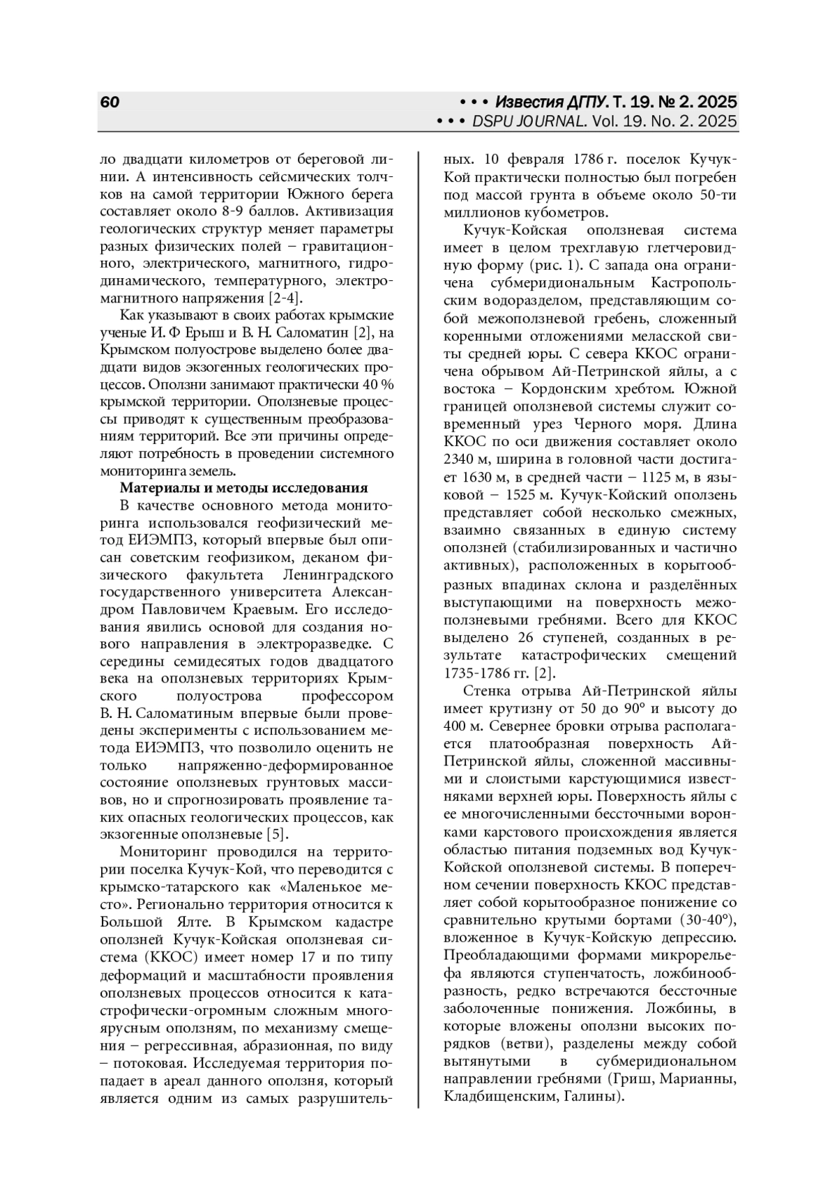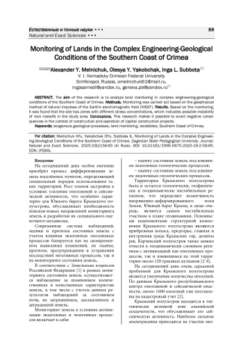 Целью исследования является анализ мониторинга земель в сложных инженерно-геологических условиях Южного берега Крыма. Методы. Мониторинг выполнялся на базе геофизического метода естественных импульсов электромагнитного поля Земли (ЕИЭМПЗ). Результаты. На основании проведенного мониторинга было установлено, что участок имеет зоны с различной концентрацией напряжений, что показывает возможную неустойчивость массивов горных пород исследуемой территории. Выводы. Данные исследования дают возможность избегать негативных последствий в условиях строительства и эксплуатации объектов капитального строительства.
