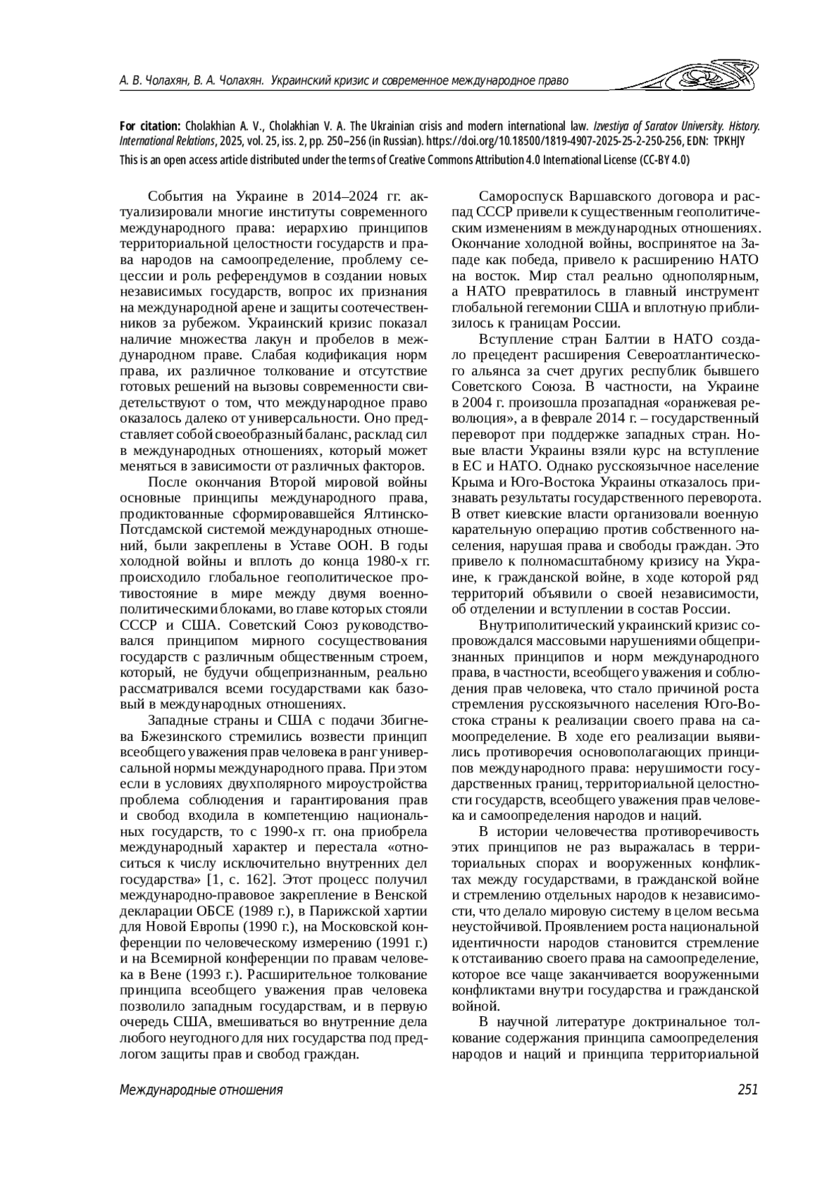4. Чолахян А. В., Чолахян В. А. Историко-правовые основы принципов территориальной целостности государств и права народов на самоопределение на современном этапе // Известия Саратовского университета. Новая серия. Серия: История. Международные отношения. 2022. Т. 22, вып. 3. С. 370-377. DOI: 10.18500/1819-4907-2022-22-3-370-377 EDN: MCUPOX