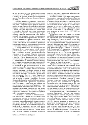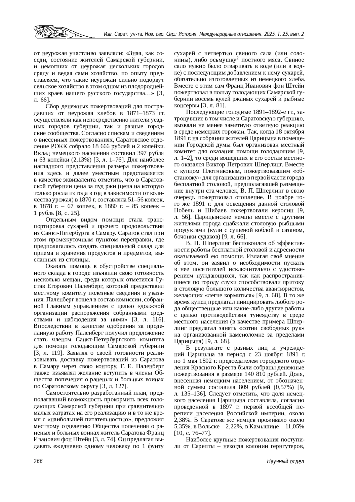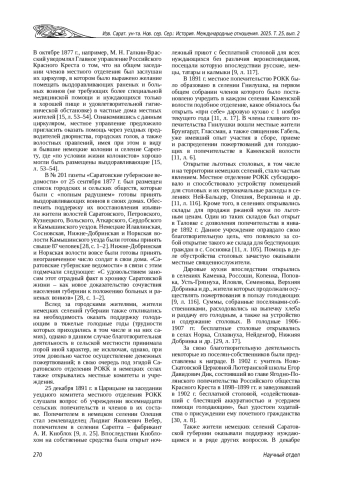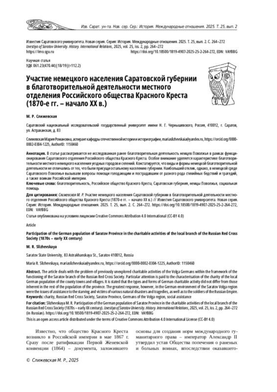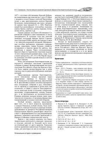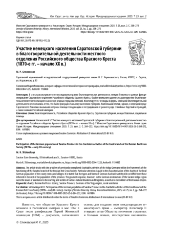 В статье рассматривается не исследованная ранее благотворительная деятельность немцев Поволжья в рамках функционирования Саратовского отделения Российского общества Красного Креста. Особое внимание уделяется характеристике благотворительности местного немецкого населения уездных городов и селений. Констатируется, что виды и формы немецкой благотворительной деятельности не отличались от тех, что были присущи остальному населению губернии. Наибольший отклик, однако, в немецкой среде Саратовского Поволжья вызывали вопросы помощи голодающим и пострадавшим от разного рода стихийных бедствий и трагедий, а также воинам Российской империи.