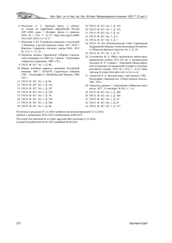 1. Морозов А. В., Скворцов В. В., Мухтаров Т. А. Общество Красного Креста в Царицыне на рубеже XIX-XX столетий // Медицинская сестра. 2017. № 7. С. 53-55. EDN: ZJUGIL