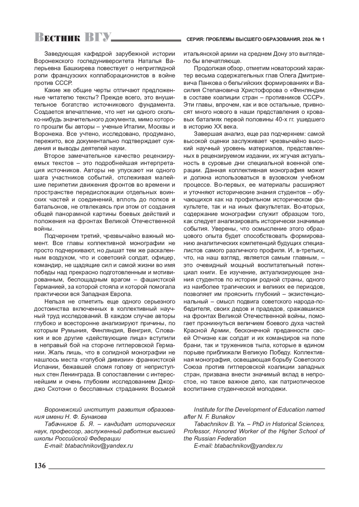 Завершая анализ, еще раз подчеркнем: самой высокой оценки заслуживает чрезвычайно высокий научный уровень материалов, представленных в рецензируемом издании, их жгучая актуальность в суровые дни специальной военной операции. Данная коллективная монография может и должна использоваться в вузовском учебном процессе. Во-первых, ее материалы расширяют и уточняют исторические знания студентов – обучающихся как на профильном историческом факультете, так и на иных факультетах. Во-вторых, содержание монографии служит образцом того, как следует анализировать исторически значимые события. Уверены, что осмысление этого образцового опыта будет способствовать формированию аналитических компетенций будущих специалистов самого различного профиля.
