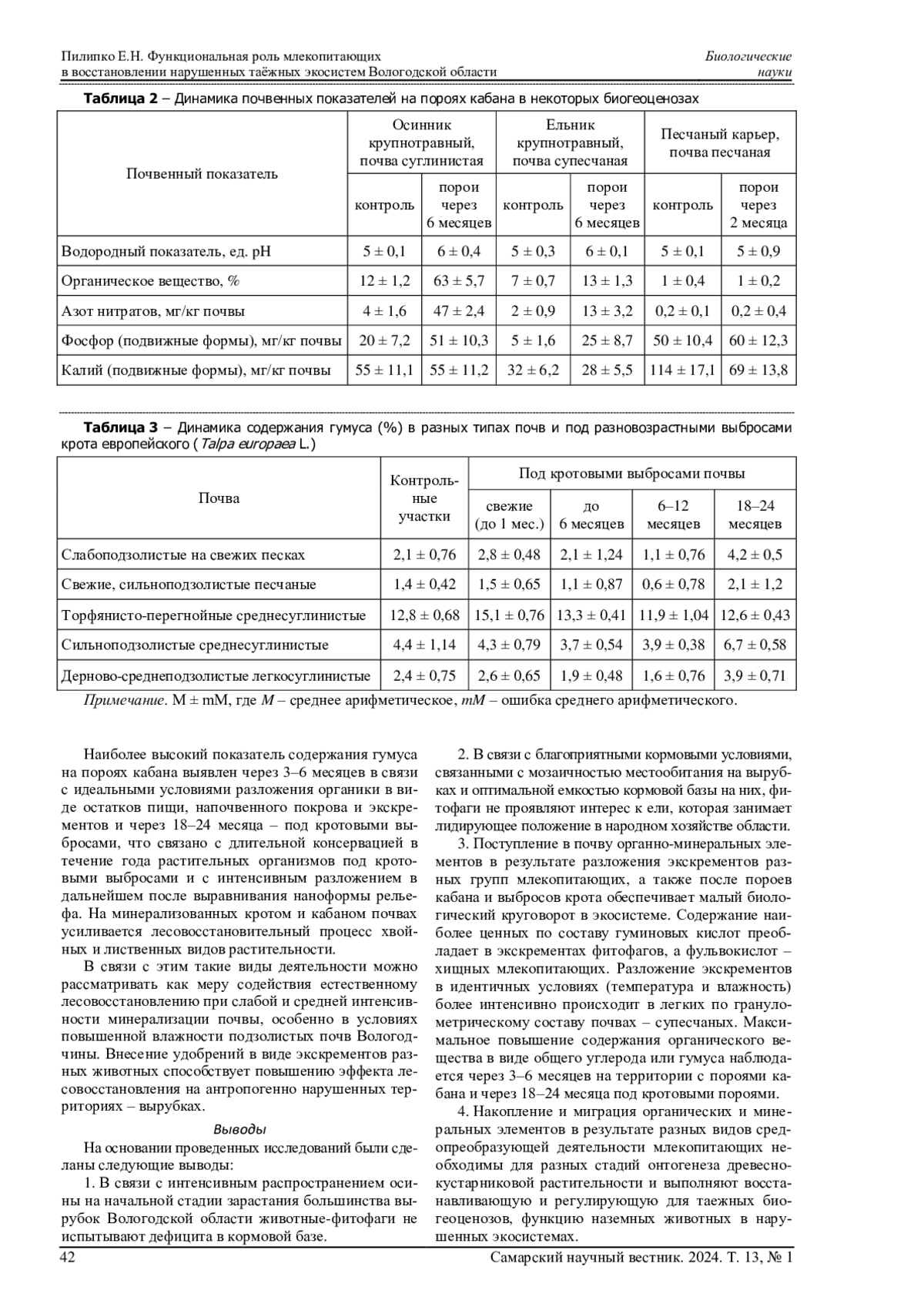 В статье рассматривается участие млекопитающих в восстановлении нарушенных экосистем. Так как в ряде регионов Северо-Запада интенсивность антропогенной нагрузки в виде лесозаготовительной деятельности не снижается, а в некоторых случаях даже повышается, то изучение степени влияния каждого компонента экосистемы на процесс восстановления нарушенных таежных биогеоценозов является актуальной проблемой и требует разностороннего рассмотрения. В Вологодской области лесозаготовительная деятельность направлена на увеличение площадей сплошных концентрированных рубок, которые оказывают серьезное влияние на лесные биогеоценозы. Средообразующая (средопреобразующая или биогеоценотическая деятельность) животных - это работа, выполняемая организмами по осуществлению и регуляции любых биогеоценотических процессов, в частности, по преобразованию веществ и энергии и поддержанию равновесного состояния системы. Проанализированы наиболее выраженные виды средопреобразующей и биогеоценотической деятельности наземных млекопитающих: трофо-механическая (на примере лося и зайца беляка), экскреторная (лось, заяц беляк, кабан, медведь, волк и лисица), выносяще-переотложная (крот) и копательно-разрыхляющая (кабан) на территории нарушенных после лесозаготовительной деятельности таежных мезоэкосистем (вырубки). Выявлено, что в результате трофико-механической деятельности фитофаги не наносят ущерба древесному фитоценозу, так как мозаичность местообитания и сукцессионные процессы в сторону лиственных растений - рябины, осины и ивы - обеспечивают млекопитающих-фитофагов кормами в достаточном количестве. Экскреторная, выносяще-переотложная и копательно-разрыхляющая деятельность млекопитающих поддерживает процесс круговорота веществ и поток энергии, что способствует самовосстановлению, самоочищению, саморегуляции и повышению устойчивости нарушенных лесных таежных экосистем Вологодчины.