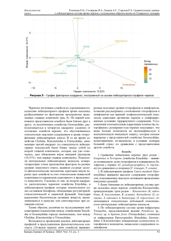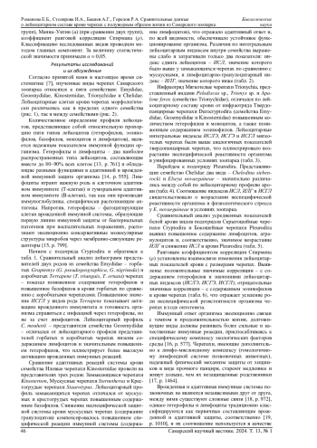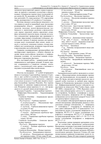 Определены лейкоцитарные формулы крови 16 видов пяти семейств черепах, ведущих полуводный образ жизни, из Самарского зоопарка. При сравнении лейкограмм представителей двух родов семейства Emydidae выявлены пониженная доля гетерофилов и повышенная доля базофилов у Graptemys ( G. pseudogeographica, G. nigrinoda ) по сравнению с Terrapene ( T. triunguis, T. ornata ). Лейкоцитарный профиль Cuora mouhotii (Geoemydidae) отличался повышенным содержанием гетерофилов, что показывало более высокую активацию врожденных иммунных реакций. Наиболее сходны по лейкоцитарному составу виды семейства Kinosternidae из трех родов: Kinosternon, Sternotherus и Staurotypus. Инфраотряд Trionychia (Trionychidae) отличался от инфраотряда Durocryptodira (Emydidae, Geoemydidae и Kinosternidae) повышенным количеством гетерофилов и моноцитов, невысоким содержанием эозинофилов. Подотряд Pleurodira (Chelidae) отличался от подотряда Cryptodira (Emydidae, Geoemydidae, Kinosternidae, Trionychidae) повышенным содержанием агранулоцитов. Выявлены отражающие усиление роли неспецифической резистентности организма черепах в ходе онтогенеза положительные значимые корреляции длины карапакса с содержанием гетерофилов и значениями лейкоцитарных индексов (соотношения лимфоцитов и эозинофилов, гетерофилов и эозинофилов, гетерофилов и лимфоцитов), отрицательные значимые корреляции с содержанием эозинофилов. Соотношение гетерофилов и лимфоцитов, являющееся показателем физиологического стресса, имело минимальное среди исследованных видов значение у Sternotherus odoratus (Kinosternidae), максимальное значение - у C. mouhotii (Geoemydidae).