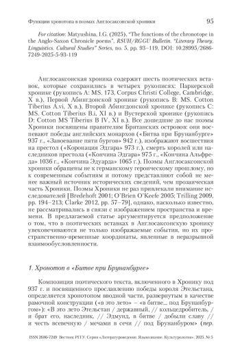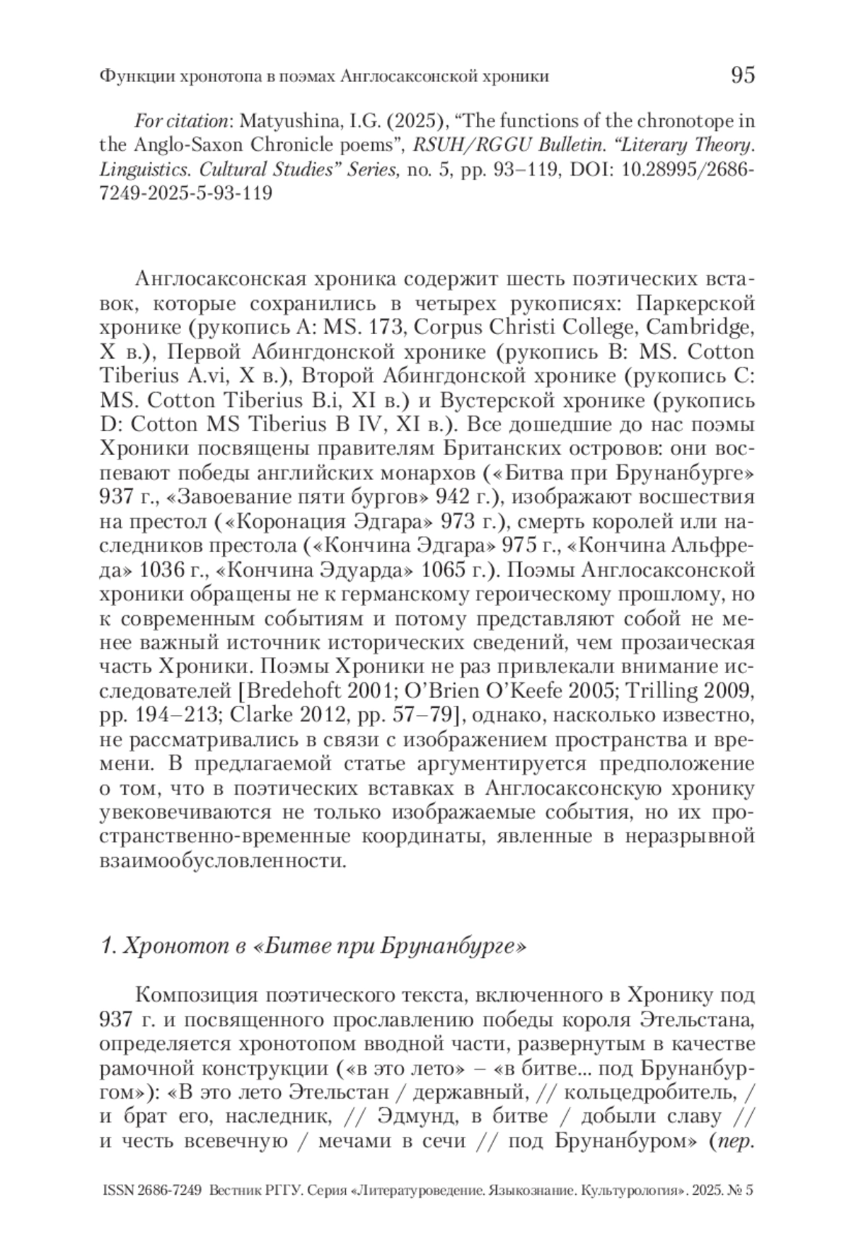 1. Гвоздецкая 2000 - Гвоздецкая Н.Ю. Поэтическое осмысление англосаксонской истории в «Битве при Брунанбурге» // Формы исторического сознания от поздней античности до эпохи Возрождения (исследования и тексты): Сб. научных трудов памяти Клавдии Дмитриевны Авдеевой. Иваново, 2000. С. 73-88.