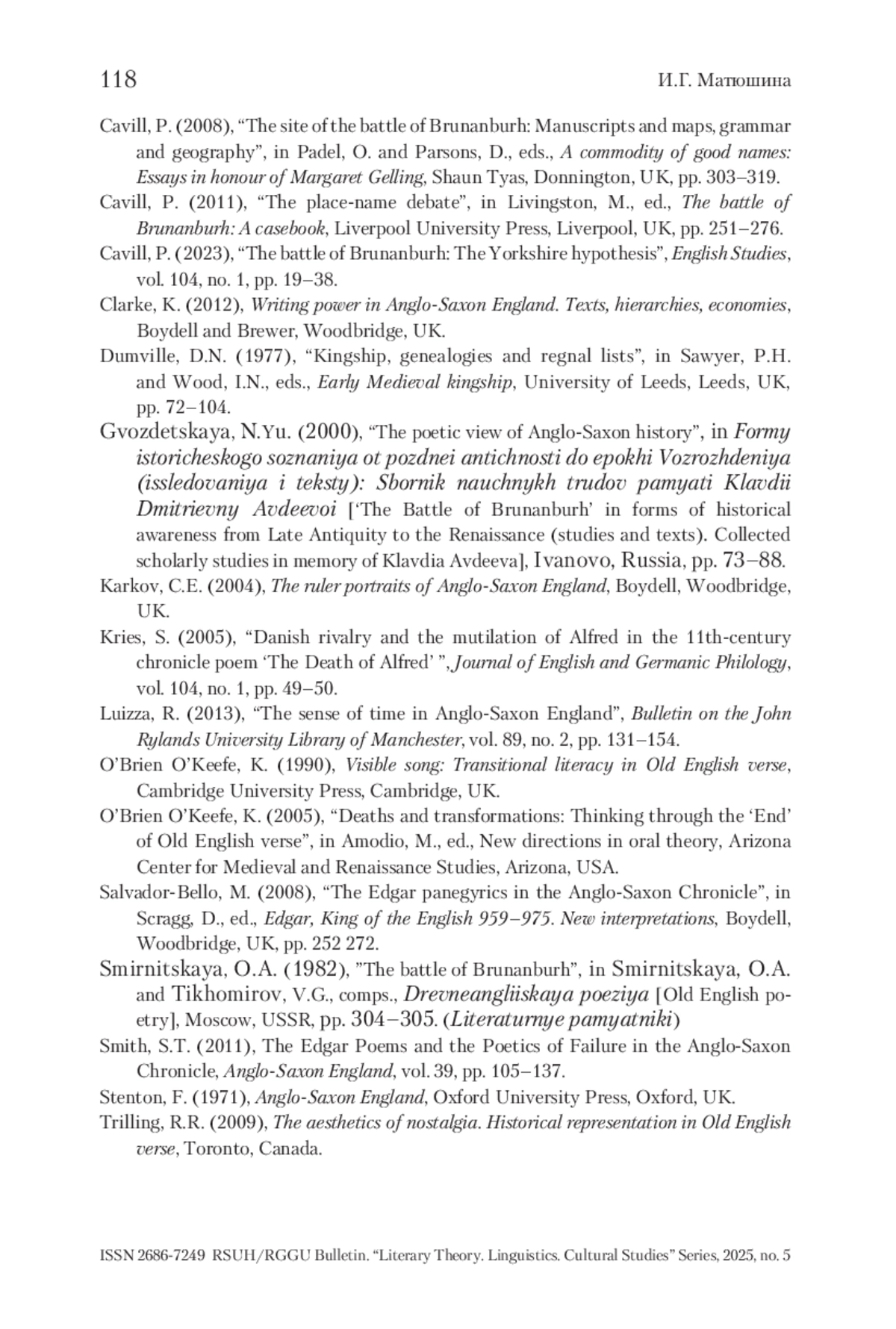 7. Cavill 2023 - Cavill P. The battle of Brunanburh: The Yorkshire hypothesis // English Studies. 2023. Vol. 104. No. 1. P. 19-38.