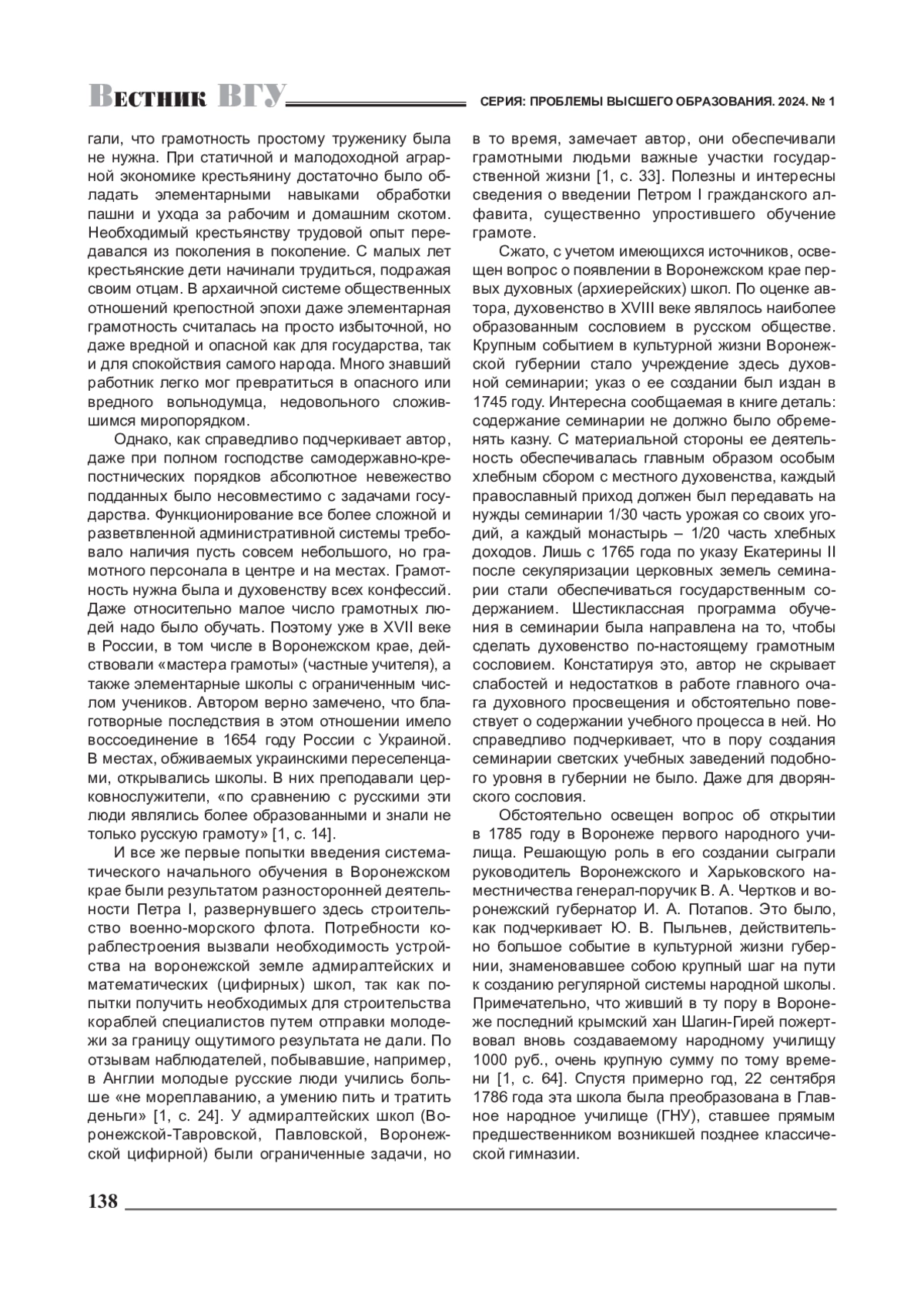 Обстоятельно освещен вопрос об открытии в 1785 году в Воронеже первого народного училища. Решающую роль в его создании сыграли руководитель Воронежского и Харьковского наместничества генерал-поручик В. А. Чертков и воронежский губернатор И. А. Потапов. Это было, как подчеркивает Ю. В. Пыльнев, действительно большое событие в культурной жизни губернии, знаменовавшее собою крупный шаг на пути к созданию регулярной системы народной школы. Примечательно, что живший в ту пору в Воронеже последний крымский хан Шагин-Гирей пожертвовал вновь создаваемому народному училищу 1000 руб., очень крупную сумму по тому времени [1, с. 64]. Спустя примерно год, 22 сентября 1786 года эта школа была преобразована в Главное народное училище (ГНУ), ставшее прямым предшественником возникшей позднее классической гимназии.