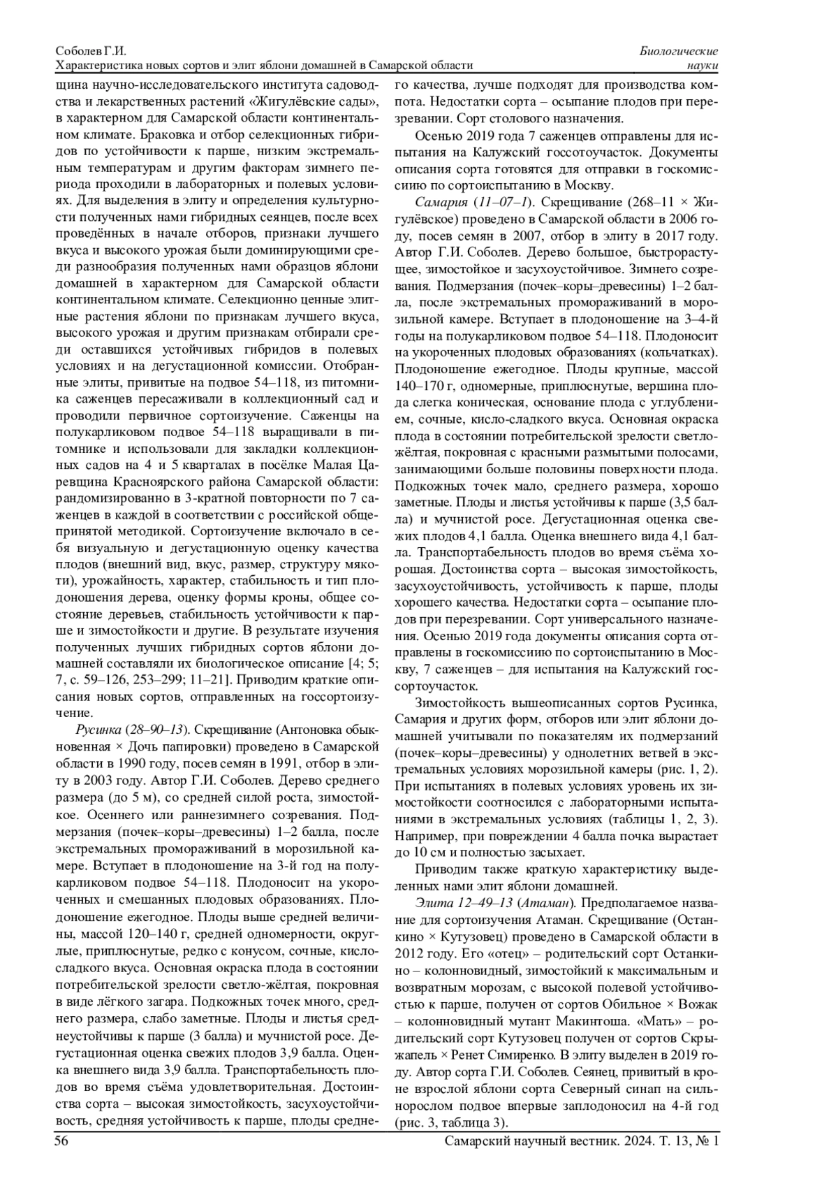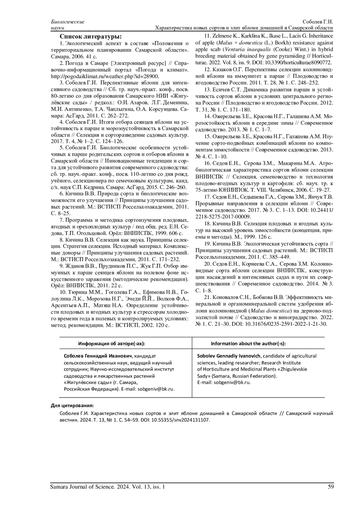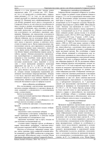 5. Соболев Г.И. Биологические особенности устойчивых к парше родительских сортов и отборов яблони в Самарской области // Инновационные тенденции и сорта для устойчивого развития современного садоводства: сб. тр. науч.-практ. конф., посв. 110-летию со дня рожд. учёного, селекционера по семечковым культурам, канд. с/х. наук С.П. Кедрина. Самара: АсГард, 2015. С. 246-260.