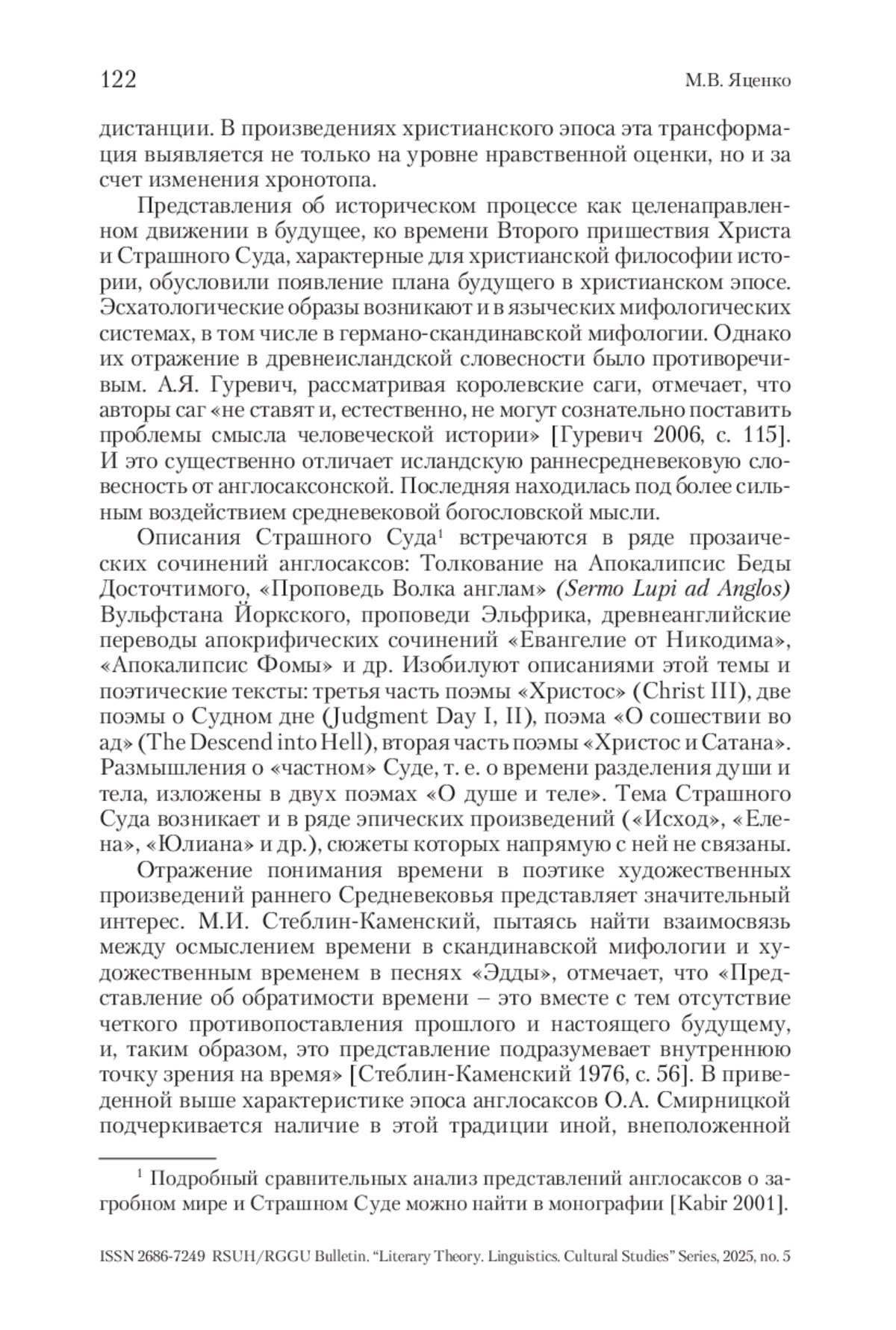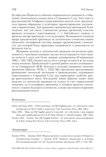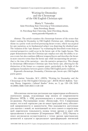 В статье рассматриваются хронотопические особенности сцен ожидания Страшного Суда, включенных в произведения древнеанглийского христианского эпоса. Обращение к данной теме предполагало описание будущих событий, что было не характерно для эпического повествования, основной объект которого – идеализированное прошлое. Нарушение эпической дистанции (доступность описываемых событий оценке с внеположенной им точки зрения) было характерно и для героического эпоса англосаксов. В данной работе показано, что христианский эпос предполагал не только возможность оценки событий, но и совмещение разных временных пластов, более конкретное, чем в героическом эпосе, описание плана будущего, а также включение в повествование плана настоящего, т. е. времени рассказывания эпоса. Такого рода изменение хронотопа отличает христианский эпос от героического и допускает возможность его выделения как самостоятельного жанра, учитывая условность жанрового деления в данной поэтической традиции.