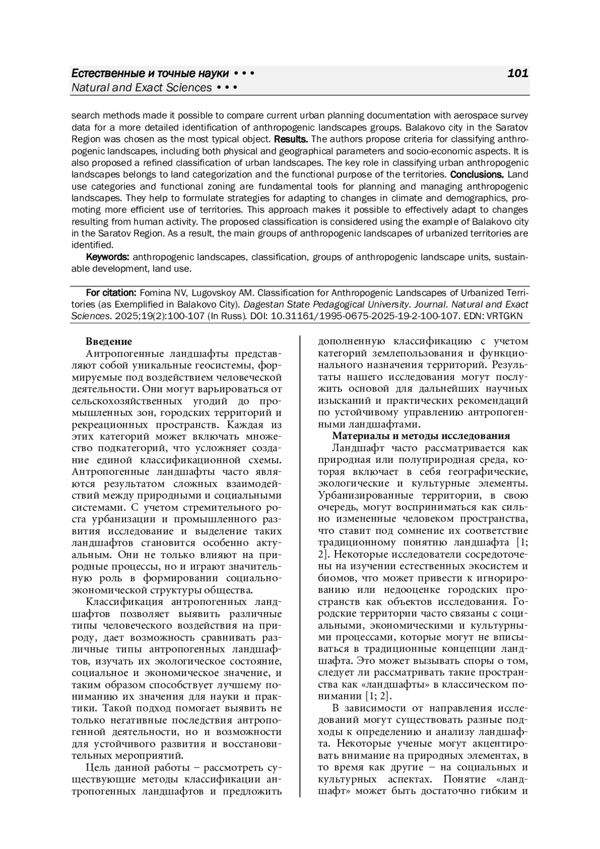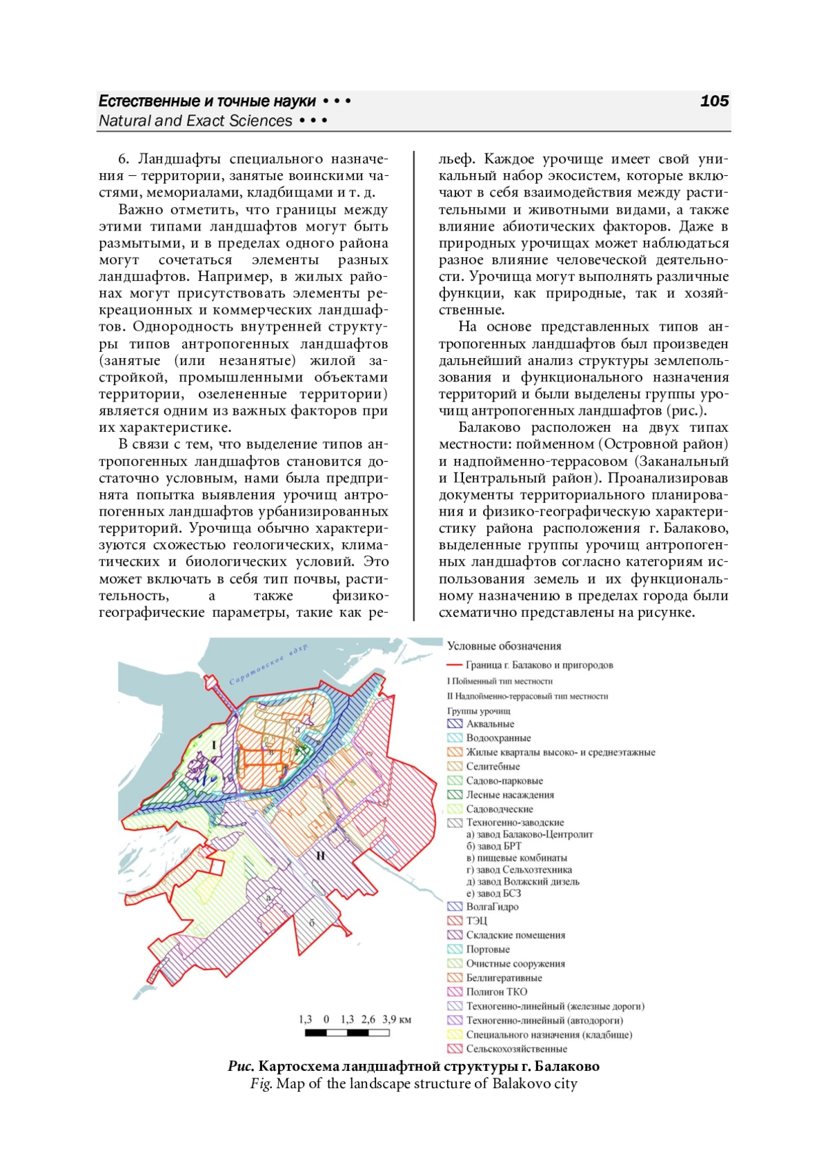 Антропогенные ландшафты представляют собой сложные системы, обладающие множеством уникальных характеристик и ценностей, которые требуют бережного отношения и комплексного управления. Цель настоящего исследования - рассмотреть существующие методы классификации антропогенных ландшафтов и предложить дополненную классификацию с учетом категорий землепользования и функционального назначения территорий. Методы. В исследовании были проанализированы существующие подходы к классификации антропогенных ландшафтов. Сравнительный и описательный методы исследования позволили сопоставить актуальную градостроительную документацию с данными аэрокосмических съемок для более детального выделения групп урочищ антропогенных ландшафтов. В качестве наиболее типичного объекта был выбран г. Балаково Саратовской области. Результаты. Авторами предложены критерии классификации антропогенных ландшафтов, включающие как физико-географические параметры, так и социально-экономические аспекты. Также предложена уточненная классификация ландшафтов урбанизированных территорий. Ключевая роль в классификации антропогенных ландшафтов городов принадлежит категорированию земель и функциональному назначению территорий. Выводы. Категории землепользования и функциональное зонирование являются основополагающими инструментами для планирования и управления антропогенными ландшафтами. Они помогают формировать стратегии адаптации к изменениям в климате и демографической ситуации, способствуя более эффективному использованию территорий. Такой подход позволит эффективно адаптироваться к изменениям, возникающим в результате человеческой деятельности. Предложенная классификация рассмотрена на примере г. Балаково Саратовской области. В результате выделены основные группы урочищ антропогенных ландшафтов урбанизированных территорий.