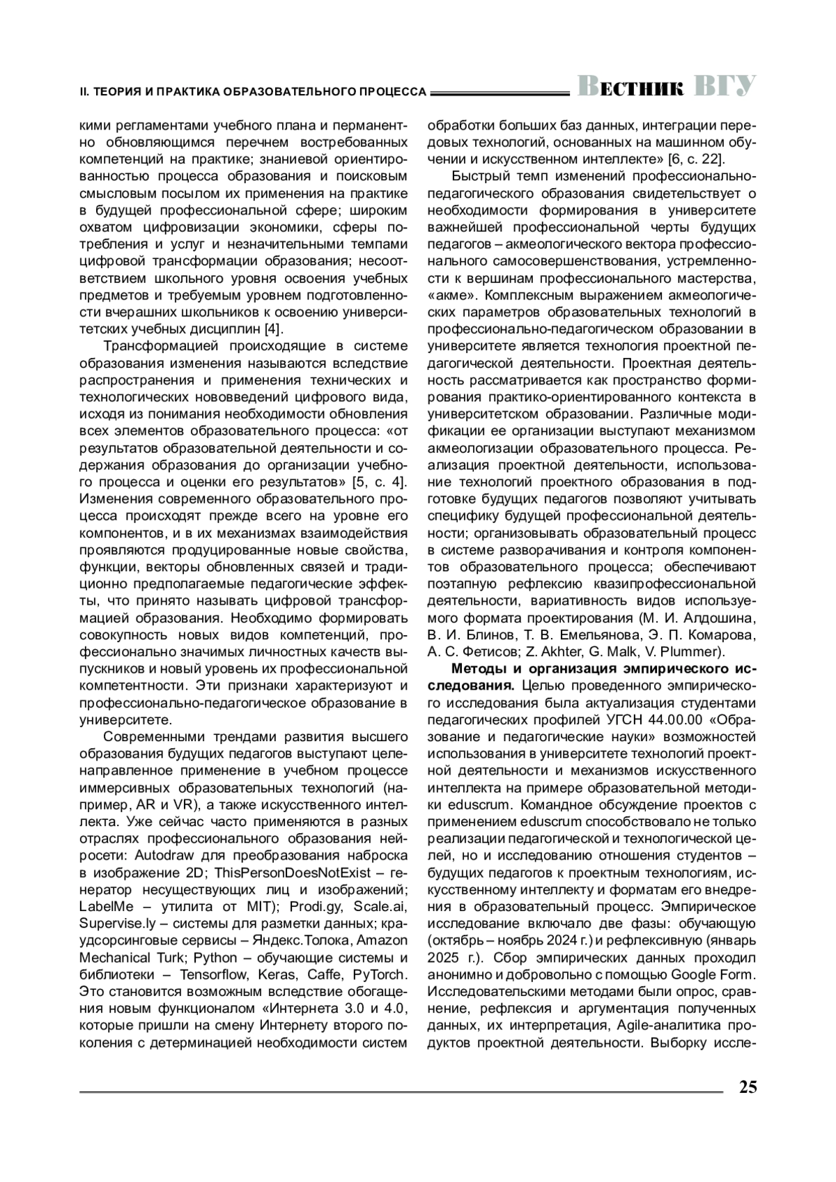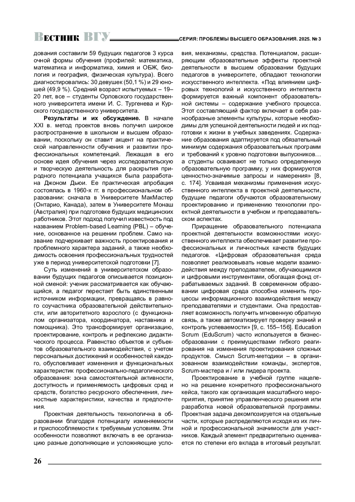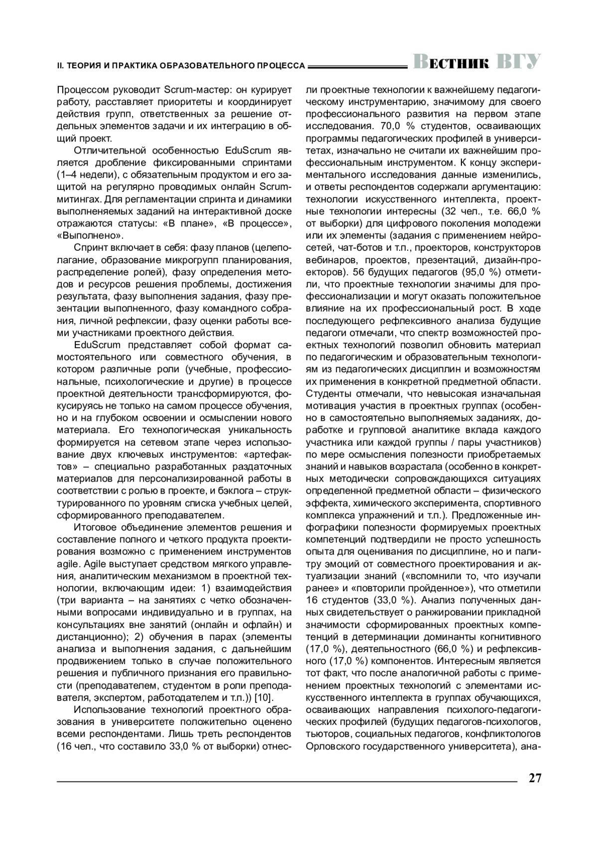 Современная ситуация технологизации всех сфер жизнедеятельности человека, цифровая трансформация экономики, сферы услуг и образования актуализируют проблему формирования цифровых проектных компетенций в профессионально-педагогическом образовании в университете. Будущие педагоги ориентируются на обновление педагогического инструментария через привлечение обновляющихся цифровых ресурсов (например, искусственного интеллекта) и механизмов (на примере ресурсов мягкого управления Agile) при взаимодействии с молодыми представителями «цифрового» поколения. Цель исследования - раскрыть сущность и особенности применения проектных технологий с элементами искусственного интеллекта (на примере образовательной стратегии EduScrum) в университетском образовании.