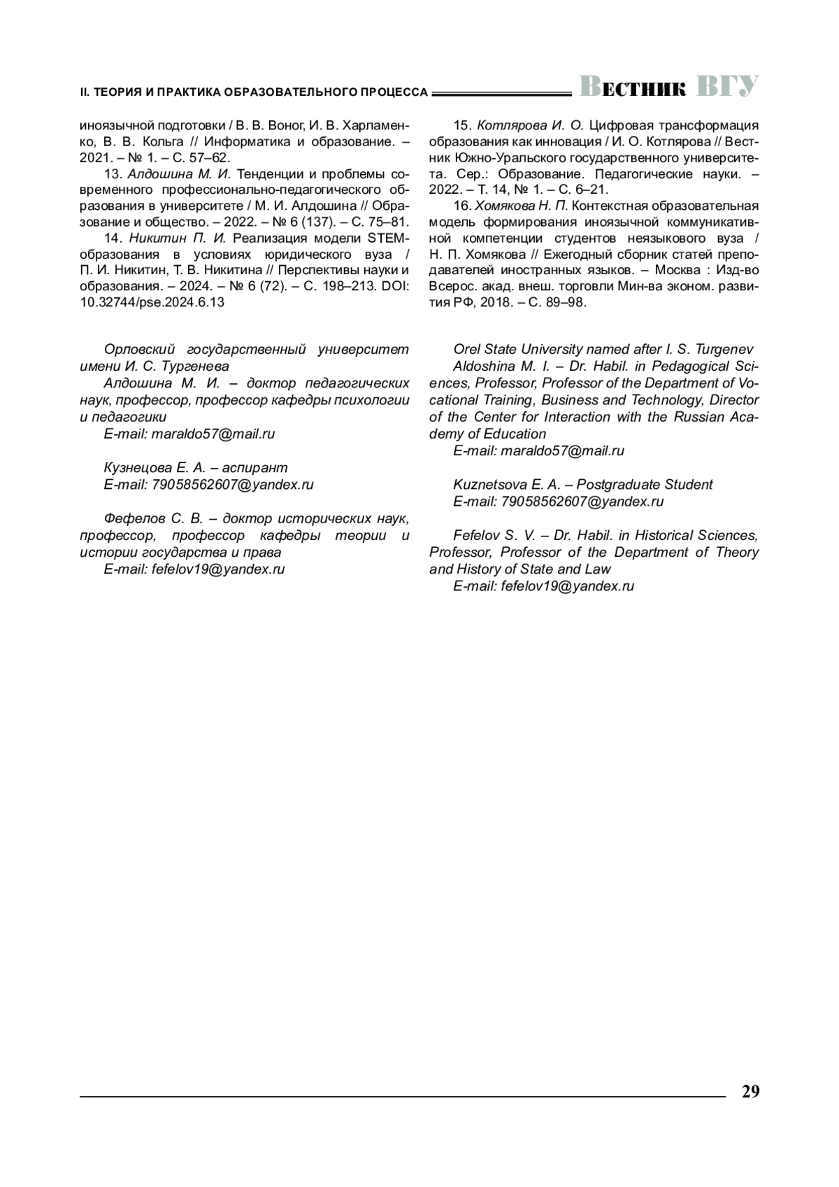 13. 	Алдошина М. И. Тенденции и проблемы современного профессионально-педагогического образования в университете / М. И. Алдошина // Образование и общество. - 2022. - № 6 (137). - С. 75-81.