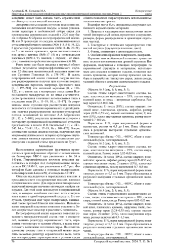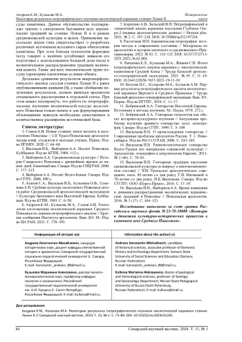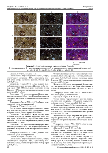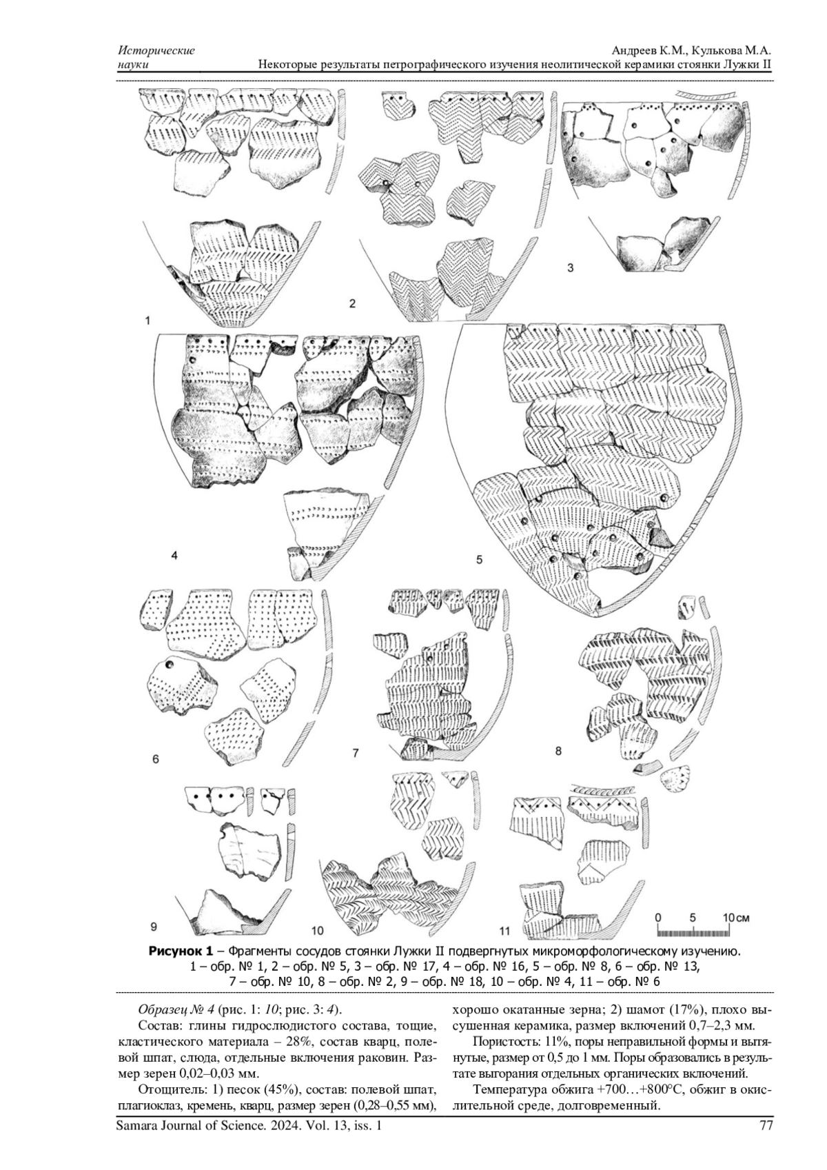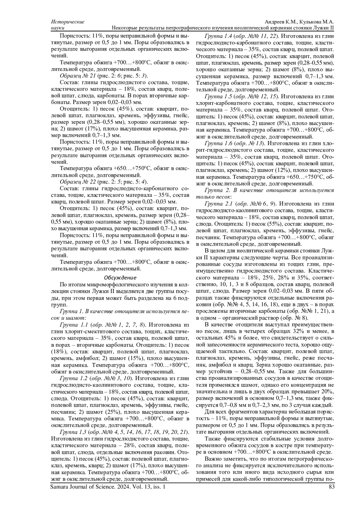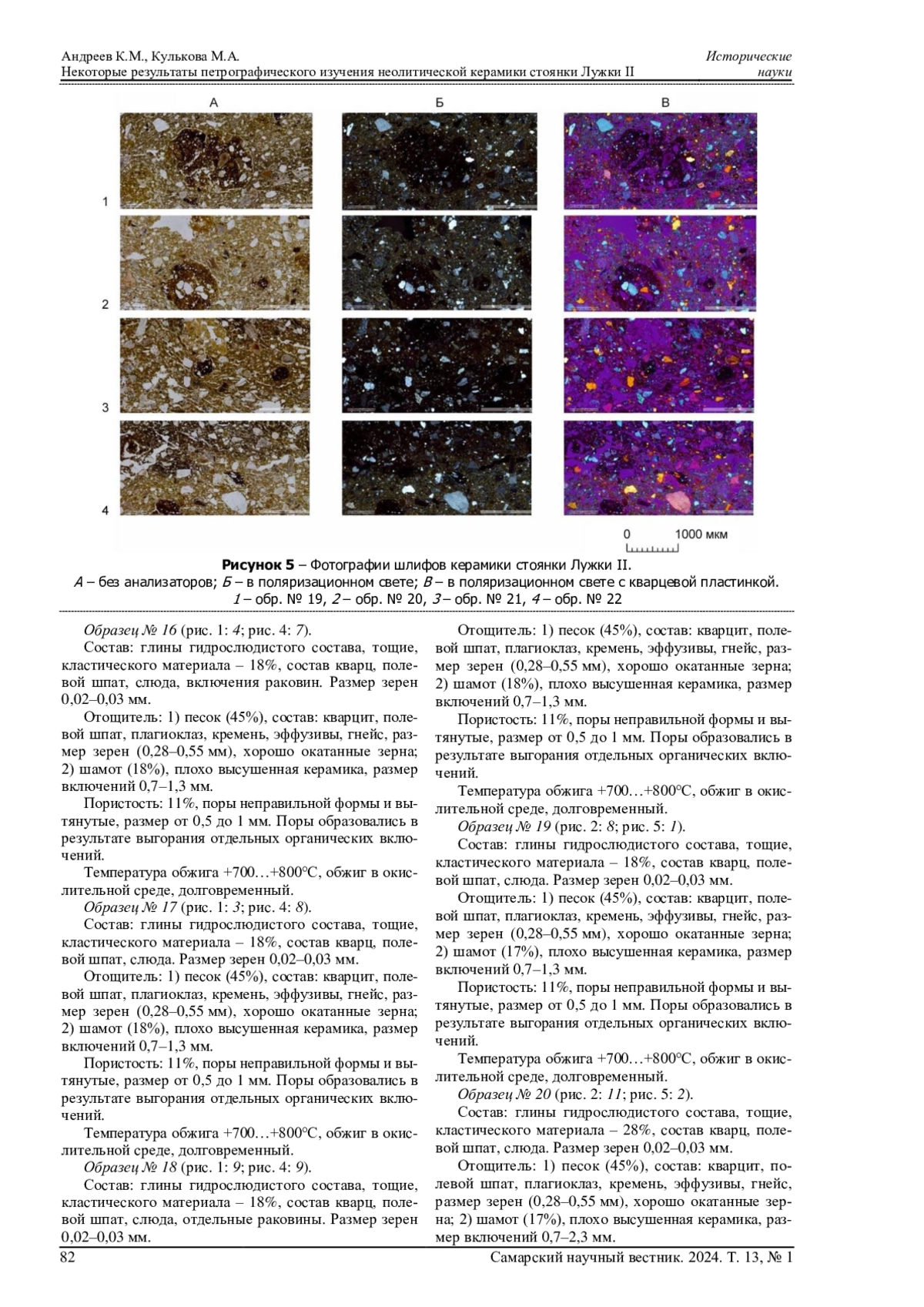 6. Андреев К.М., Кулькова М.А., Сомов А.В. Технология изготовления неолитической керамики Среднего Поволжья по данным петрографического анализа // Краткие сообщения Института археологии. Вып. 263. М.: Изд-во ИА РАН, 2021. С. 378-393. EDN: RRIXXO