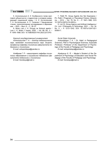 7. 	Антопольский А. К. Особенности типов групповой субъектности у подростков в условиях развивающей социальной среды / А. К. Антопольский, Т. А. Антопольская, А. С. Силаков // Герценовские чтения: психологические исследования в образовании. - 2023. - Вып. 6. - С. 30-37.