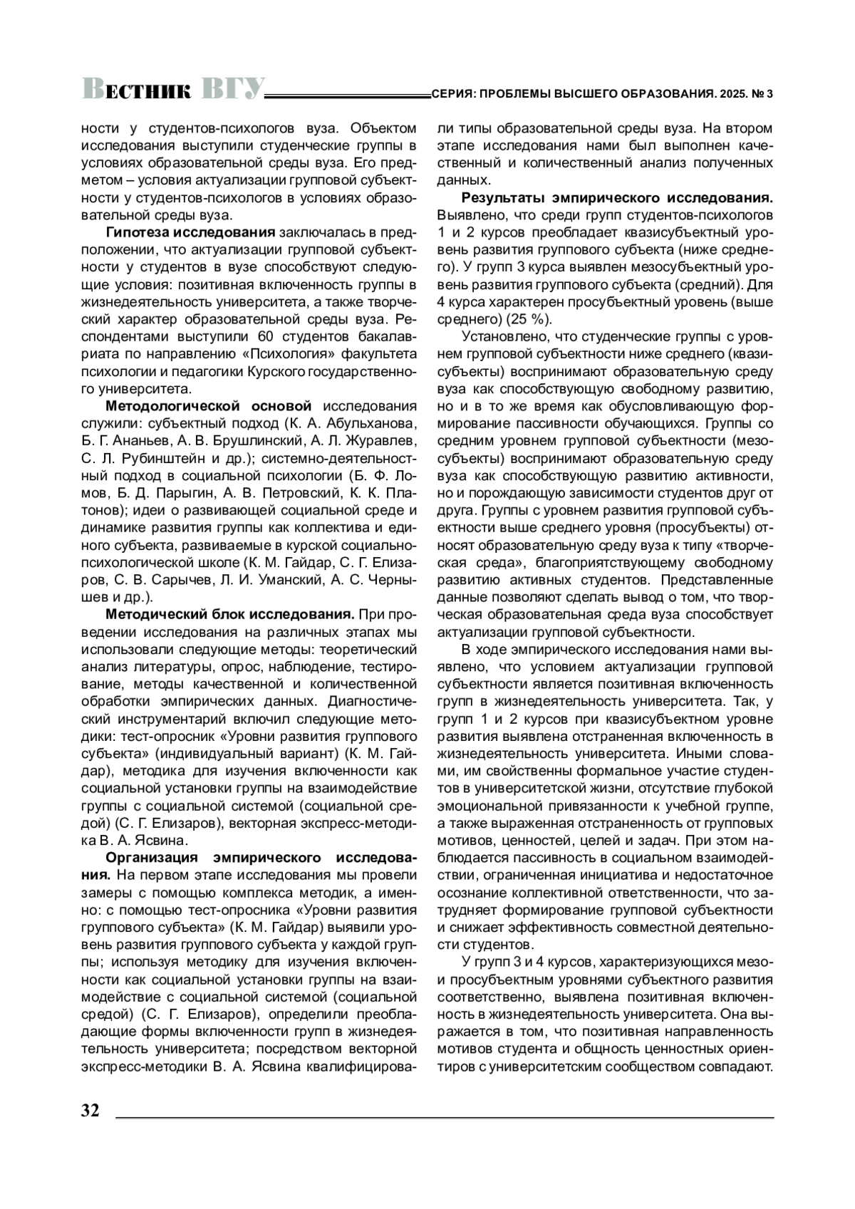 В статье рассматриваются условия актуализации групповой субъектности у студентов-психологов вуза. Анализируются социально-психологические подходы к исследованию групповой субъектности в российской и зарубежной психологии. Учебные группы студентов характеризуются как специфические объекты изучения в социальной психологии, а образовательная среда вуза - как условие актуализации групповой субъектности у студентов. Представлены результаты эмпирического исследования групповой субъектности у студентов-психологов.
