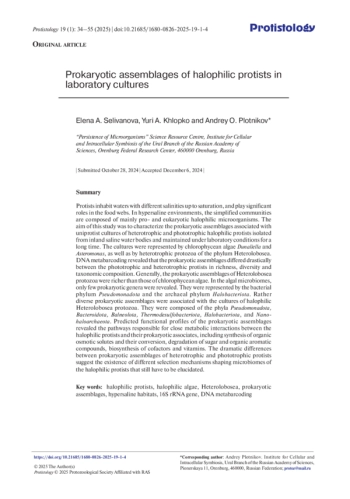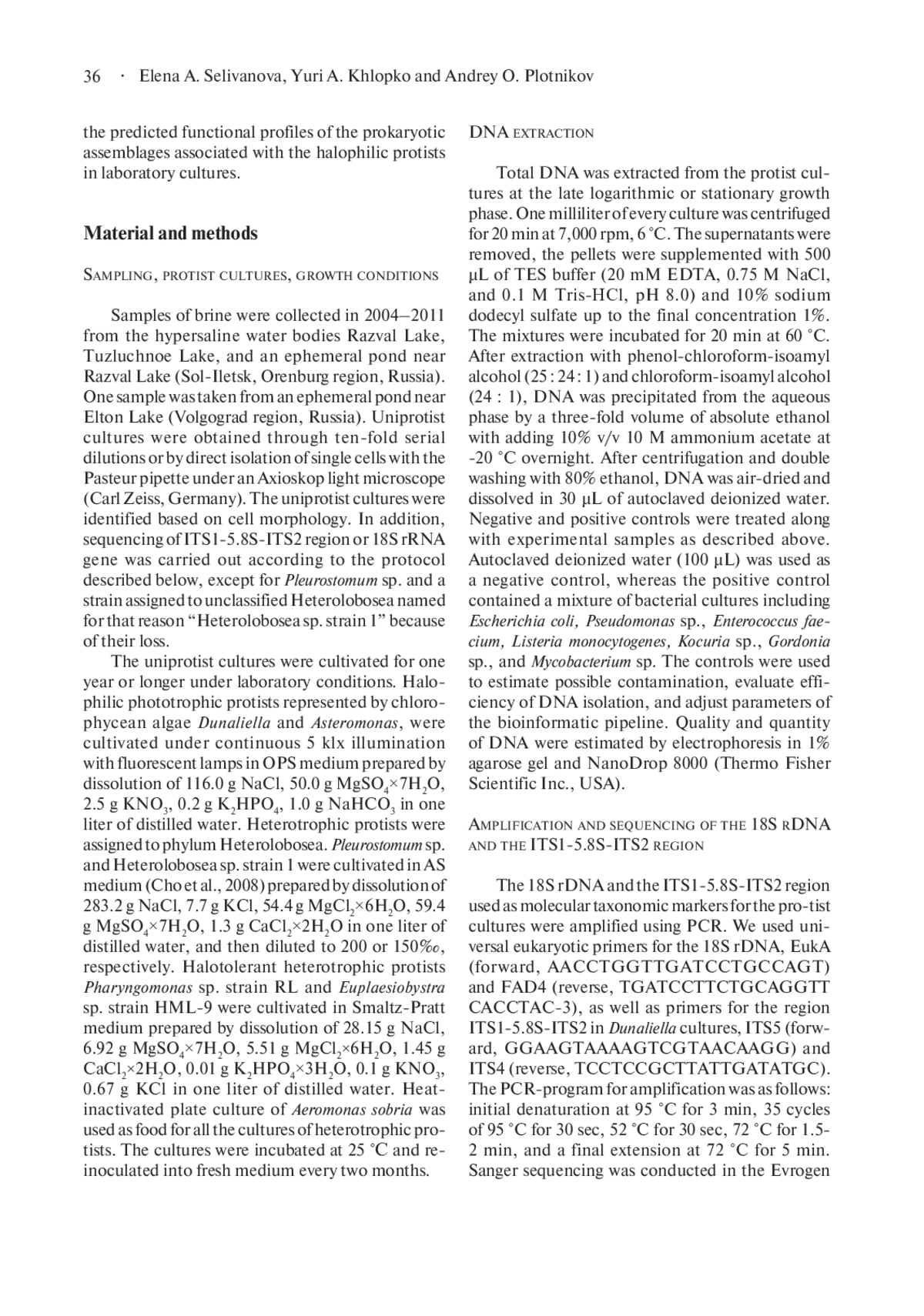 76. 	Selivanova E.A., Poshvina D.V., Khlopko Y.A., Gogoleva N.E. et al. 2018. Diversity of prokaryotes in planktonic communities of saline Sol-Iletsk lakes (Orenburg oblast, Russia). Microbiology. 87: 569-582. DOI: 10.1134/S0026261718040161