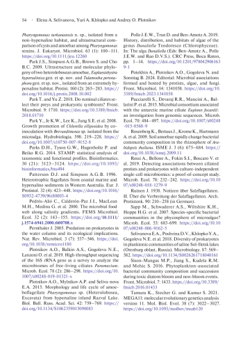 32. 	Kirby W.A., Tikhonenkov D.V., Mylnikov A.P., Janouškovec J. et al. 2015. Characterization of Tulamoeba bucina n. sp., an extremely halotolerant amoeboflagellate heterolobosean belonging to the Tulamoeba-Pleurostomum clade (Tulamoebidae n. fam.). J. Eukaryot. Microbiol. 62 (2): 227-238. DOI: 10.1111/jeu.12172