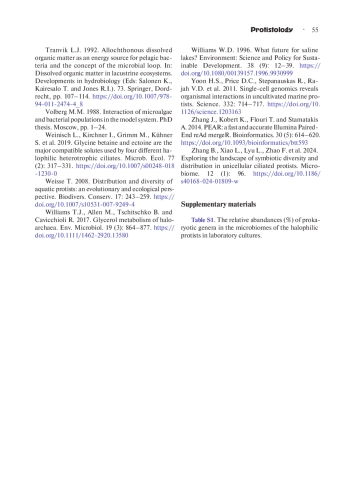 81. 	Weinisch L., Kirchner I., Grimm M., Kühner S. et al. 2019. Glycine betaine and ectoine are the major compatible solutes used by four different halophilic heterotrophic ciliates. Microb. Ecol. 77 (2): 317-331. DOI: 10.1007/s00248-018-1230-0
