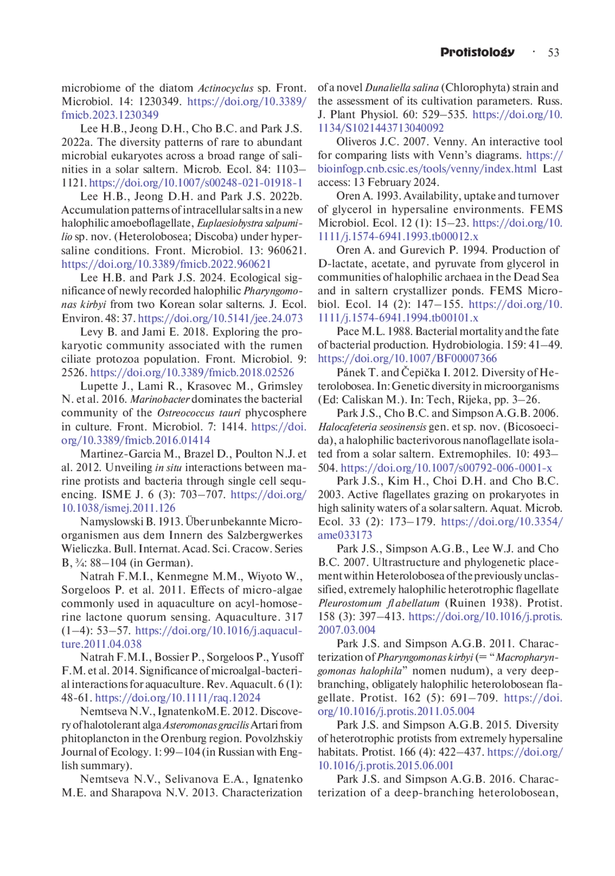 39. 	Lee H.B., Jeong D.H. and Park J.S. 2022b. Accumulation patterns of intracellular salts in a new halophilic amoeboflagellate, Euplaesiobystra salpumilio sp. nov. (Heterolobosea; Discoba) under hypersaline conditions. Front. Microbiol. 13: 960621. DOI: 10.3389/fmicb.2022.960621