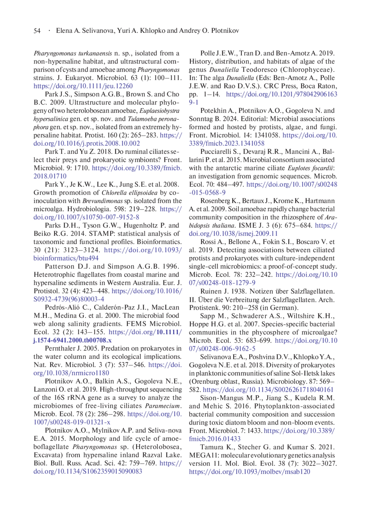 68. 	Plotnikov A.O., Mylnikov A.P. and Selivanova E.A. 2015. Morphology and life cycle of amoeboflagellate Pharyngomonas sp. (Heterolobosea, Excavata) from hypersaline inland Razval Lake. Biol. Bull.Russ. Acad. Sci. 42: 759-769. DOI: 10.1134/S1062359015090083