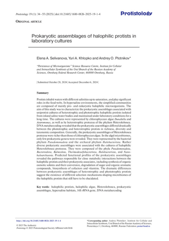 70. 	Potekhin A., Plotnikov A.O., Gogoleva N. and Sonntag B. 2024. Editorial: Microbial associations formed and hosted by protists, algae, and fungi. Front. Microbiol. 14: 1341058. DOI: 10.3389/fmicb.2023.1341058