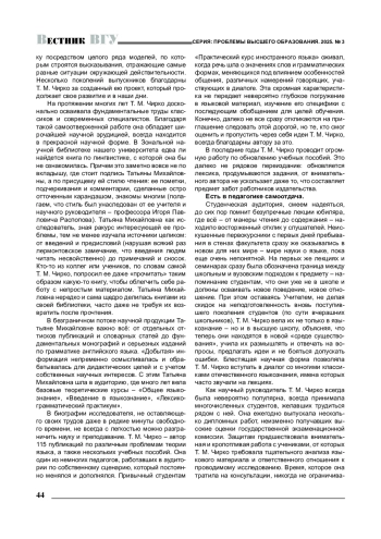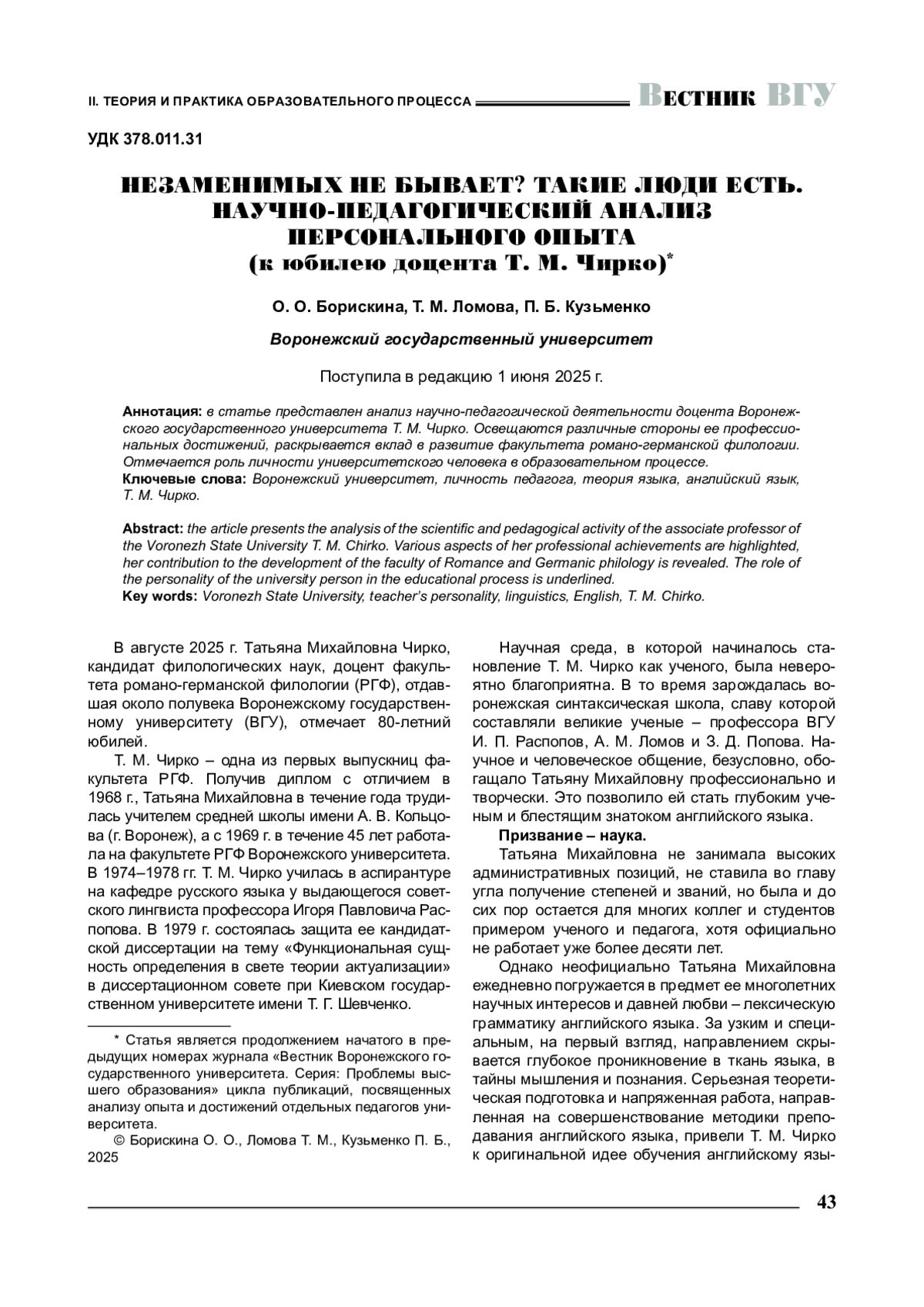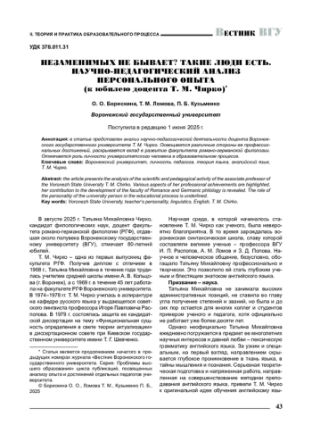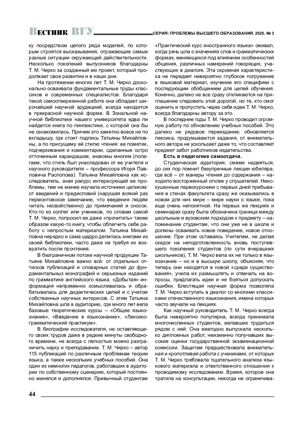 В статье представлен анализ научно-педагогической деятельности доцента Воронежского государственного университета Т. М. Чирко. Освещаются различные стороны ее профессиональных достижений, раскрывается вклад в развитие факультета романо-германской филологии. Отмечается роль личности университетского человека в образовательном процессе.