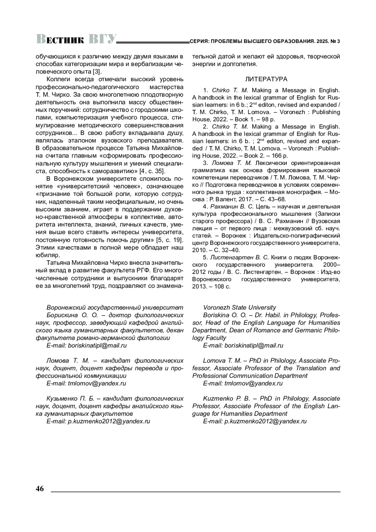 3. Ломова Т. М. Лексически ориентированная грамматика как основа формирования языковой компетенции переводчиков / Т. М. Ломова, Т. М. Чирко // Подготовка переводчиков в условиях современного рынка труда : коллективная монография. - Москва : Р. Валент, 2017. - С. 43-68.
