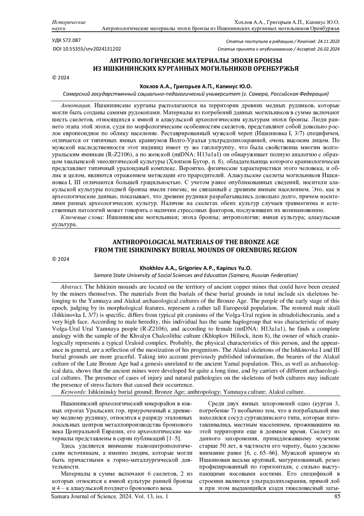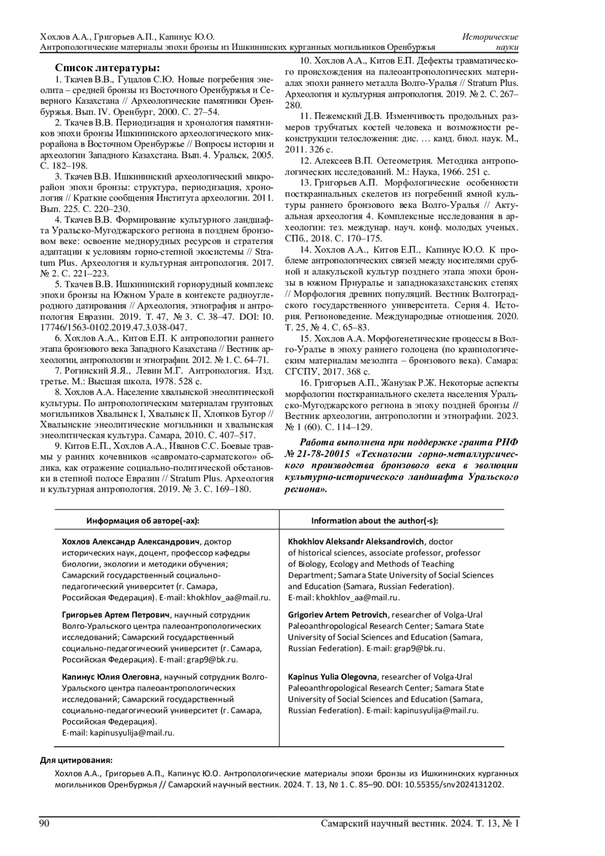 14. 	Хохлов А.А., Китов Е.П., Капинус Ю.О. К проблеме антропологических связей между носителями срубной и алакульской культур позднего этапа эпохи бронзы в южном Приуралье и западноказахстанских степях // Морфология древних популяций. Вестник Волгоградского государственного университета. Серия 4. История. Регионоведение. Международные отношения. 2020. Т. 25, № 4. С. 65-83. EDN: FXVWEB