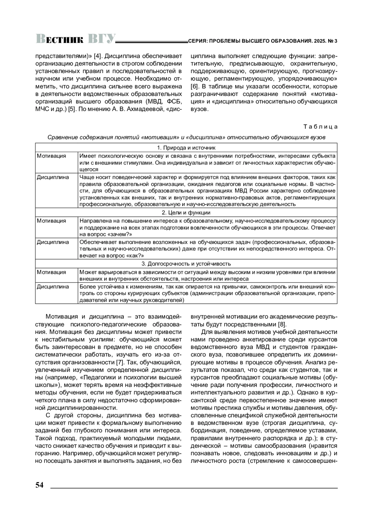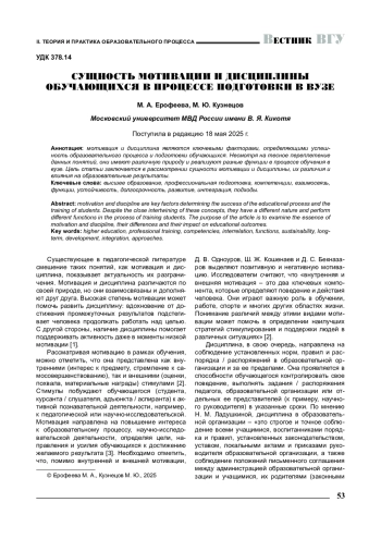 Мотивация и дисциплина являются ключевыми факторами, определяющими успешность образовательного процесса и подготовки обучающихся. Несмотря на тесное переплетение данных понятий, они имеют различную природу и реализуют разные функции в процессе обучения в вузе. Цель статьи заключается в рассмотрении сущности мотивации и дисциплины, их различия и влияния на образовательные результаты.