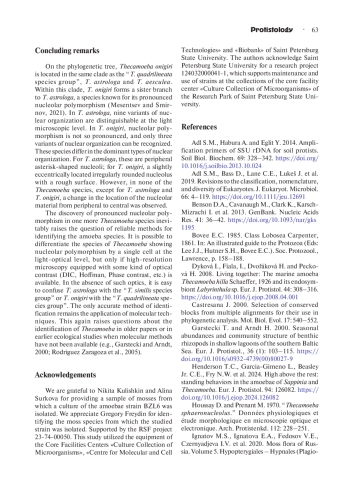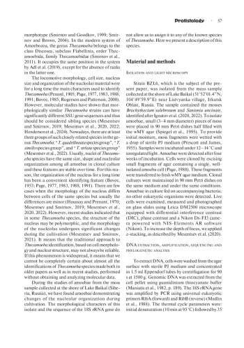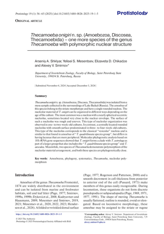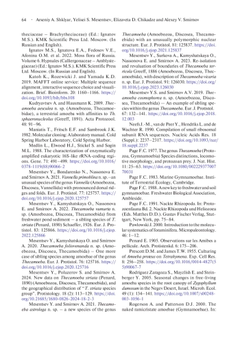 16. Mesentsev Y., Kamyshatskaya O., Nassonova E. and Smirnov A. 2022. Thecamoeba vumurta n. sp. (Amoebozoa, Discosea, Thecamoebida) from freshwater pond sediment - a sibling species of T. striata (Penard, 1890) Schaeffer, 1926. Eur. J. Protistol. 83: 125866. DOI: 10.1016/j.ejop.2022.125866